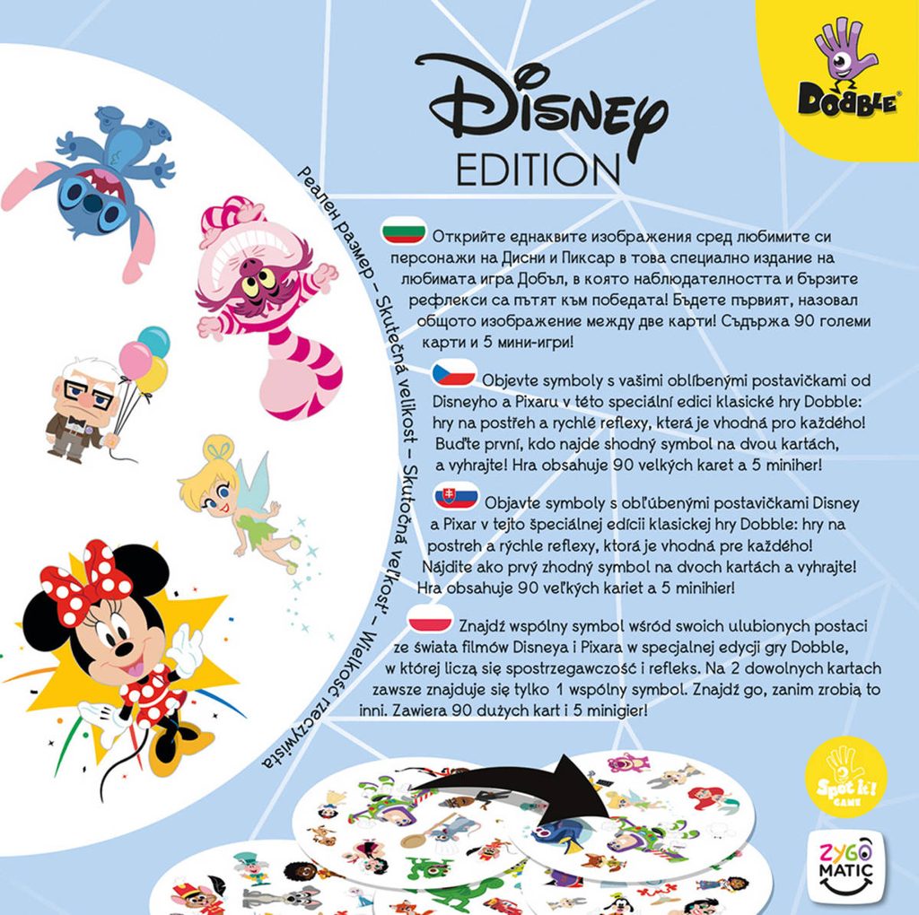 Objevte symboly s vašimi oblíbenými postavičkami od Disneyho a Pixaru v této speciální edici klasické hry Dobble: hry na postřeh a rychlé reflexy, která je vhodná pro každého! Buďte první, kdo najde shodný symbol na dvou kartách, a vyhrajte! Hra obsahuje 90 velkých karet (větších než u klasické hry Dobble) a 5 miniher! Na každé z 90 kartiček se nachází 10 symbolů. Celkem je ve hře 91 jedinečných symbolů. Na dvou libovolných kartách je vždy pouze jeden symbol stejný. Oproti zvyklostem není tato verze hry balena v plechové krabičce.