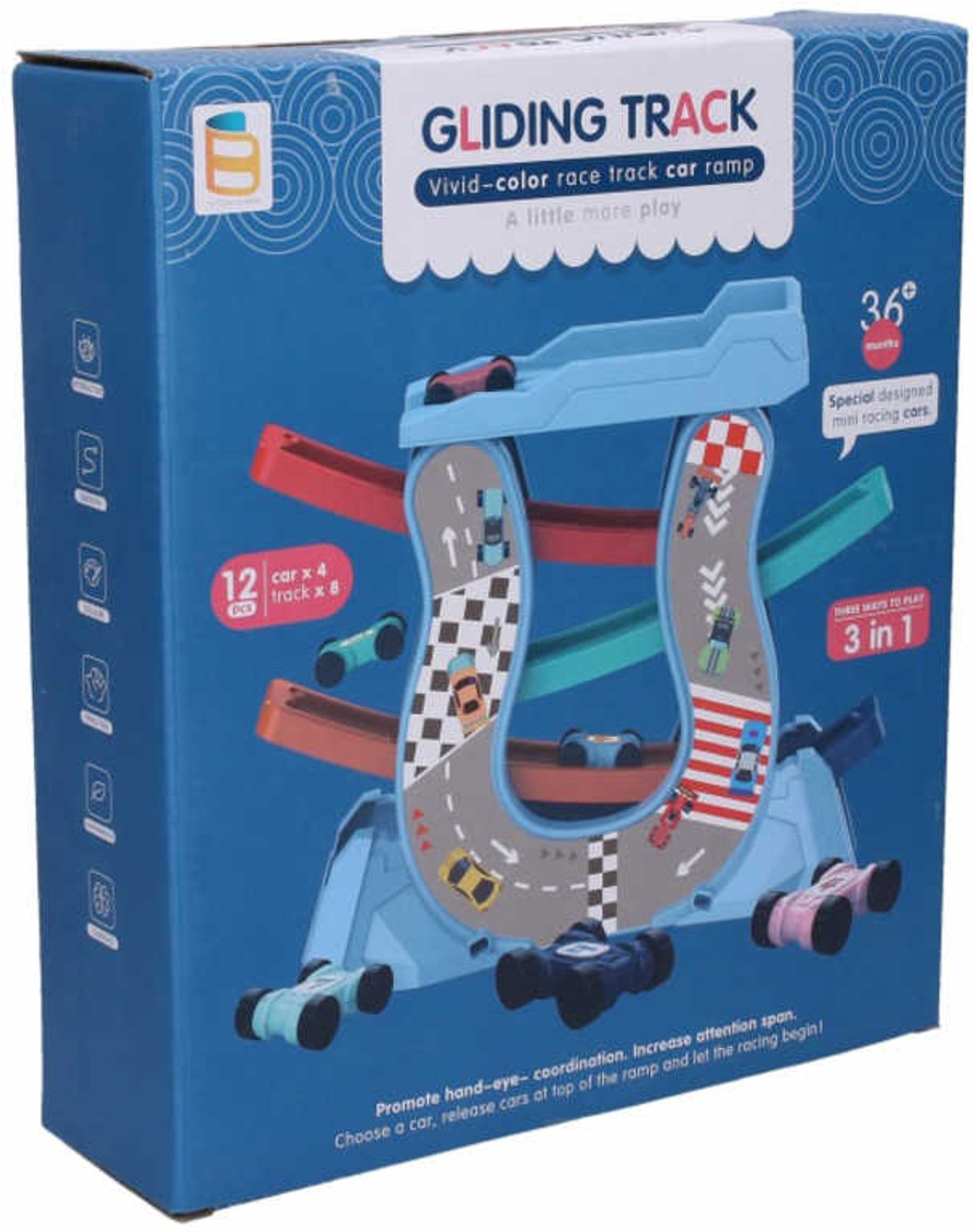 Autodráha s rampami set 8 dílů + 4 překlápěcí autíčka v krabici ▶