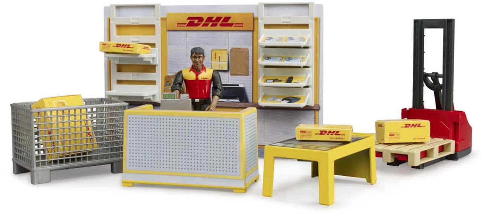 BRUDER 62251 DHL Shop set s figurkou a paletovým vozíkem