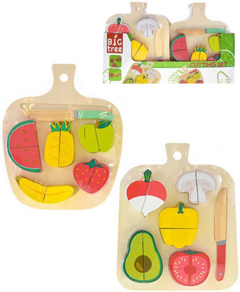 Dřevěné napodobeniny potravin na suchý zip z plastu. Sada obsahuje různé druhy potravin, prkénko a nožík, kterým můžete potraviny krájet. Dětské makety krájecího ovoce a zeleniny na suchý zip s