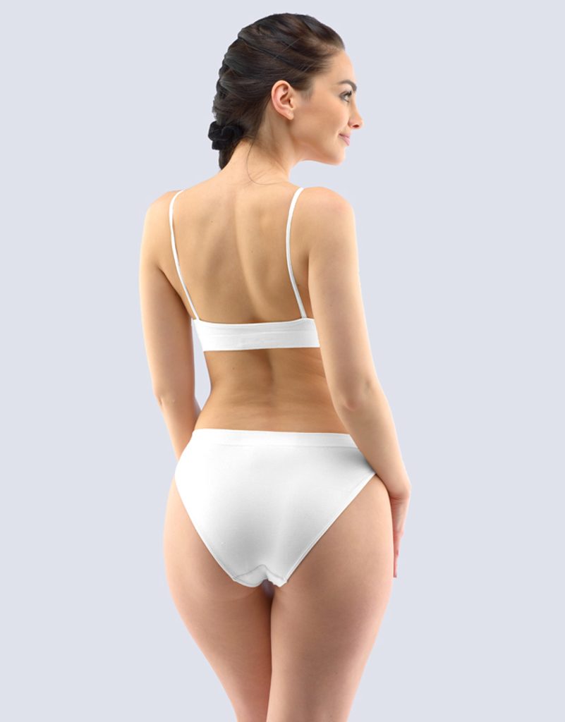 Kalhotky klasického střihu s úzkým bokem, dámské bezešvé prádlo. Pasový kraj je zesílený a zapravený bezešvým způsobem. V nohavičkách je zašitá úzká pruženka. Kalhotky jsou jednobarevné. V záložce je vypletené logo v šedé barvě.