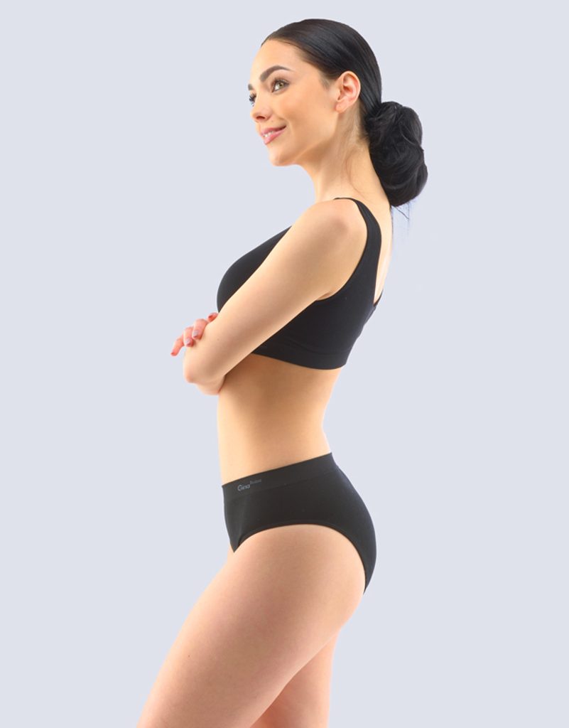 Kalhotky klasického střihu se širším bokem, dámské bezešvé prádlo. Pasový kraj je zesílený a zapravený bezešvým způsobem. V nohavičkách je zašitá úzká pruženka. Kalhotky jsou jednobarevné. V záložce je vypletené logo v šedé barvě.