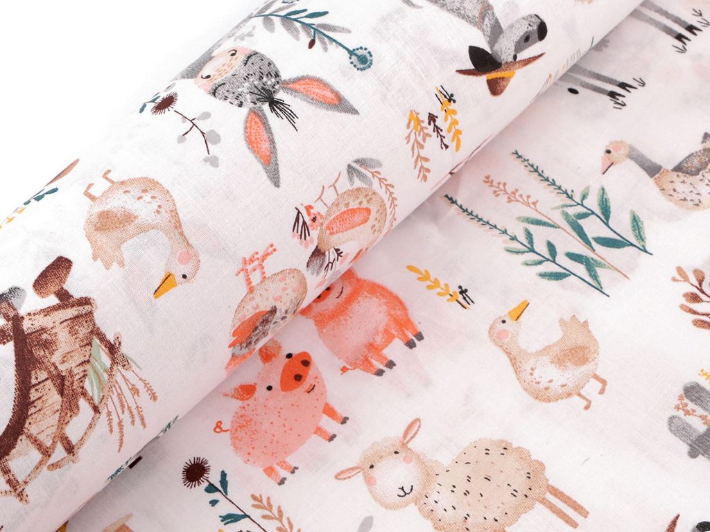Toto bavlněné plátno o šíři 160 cm a gramáži 115 g/m² je vyrobeno ze 100 % bavlny a zdobeno roztomilým potiskem domácích zvířátek – od slepic přes krávy až po kočky, které oživí každý dětský projekt