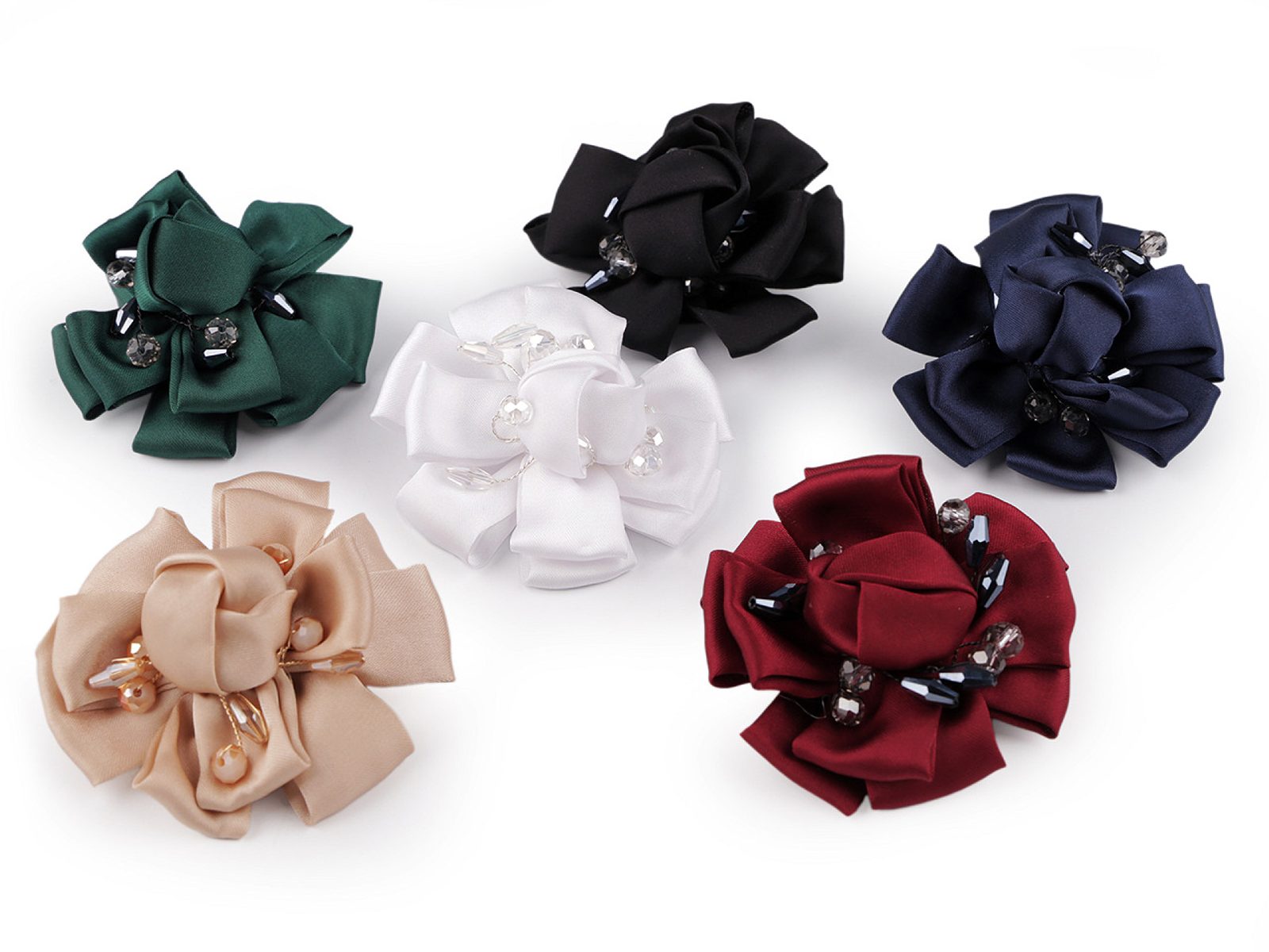 Brož saténový květ s broušenými kamínky Ø7 cm