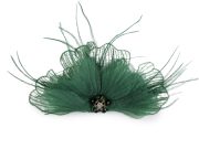 Materiál: cca 11 x 16 cm, bižuterní kov s galvanizací, polyester, sklo, peří