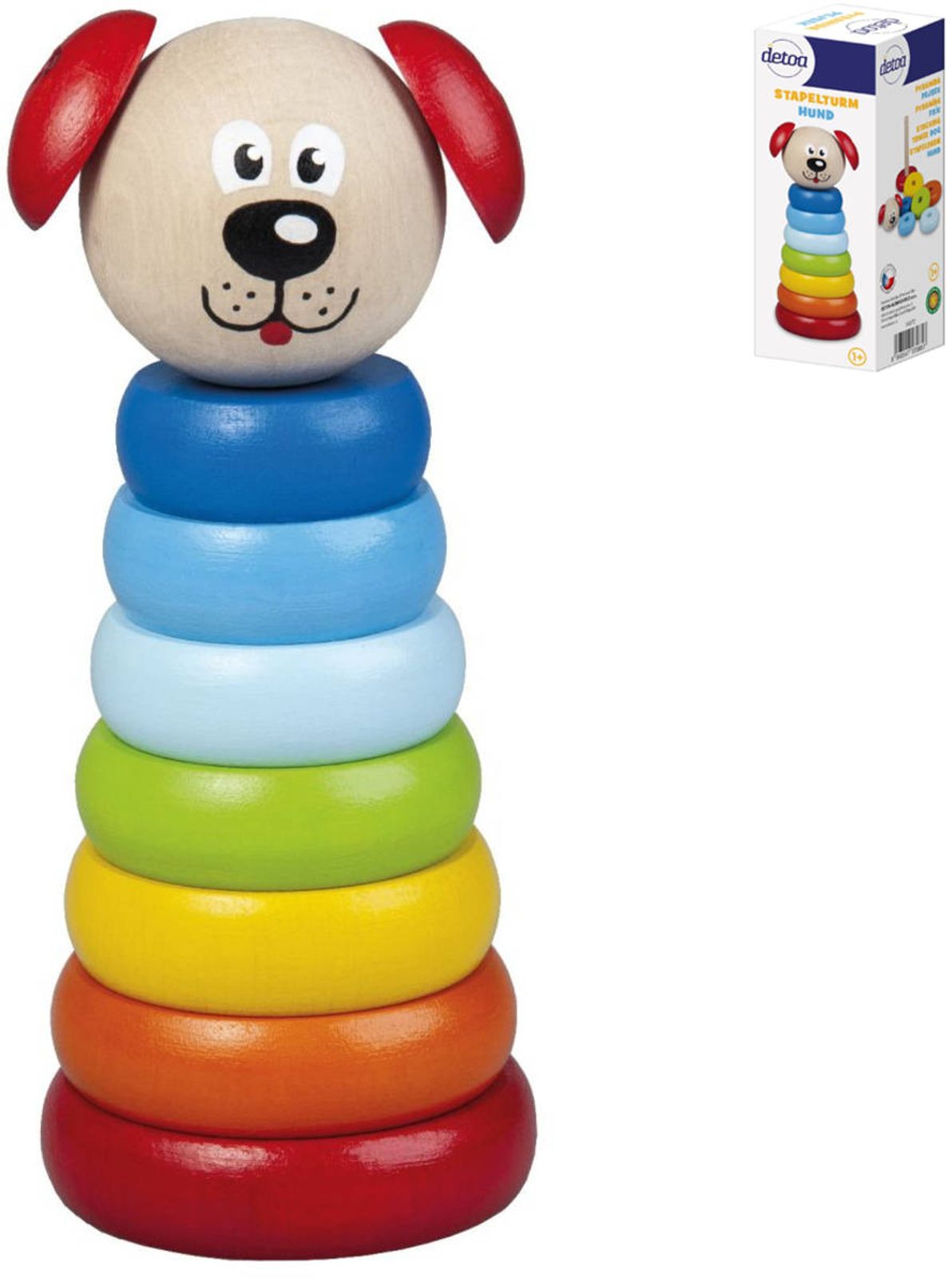 DETOA DŘEVO Baby pyramida navlékací věžička pejsek duhová