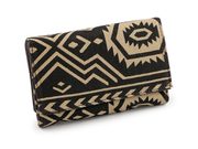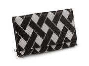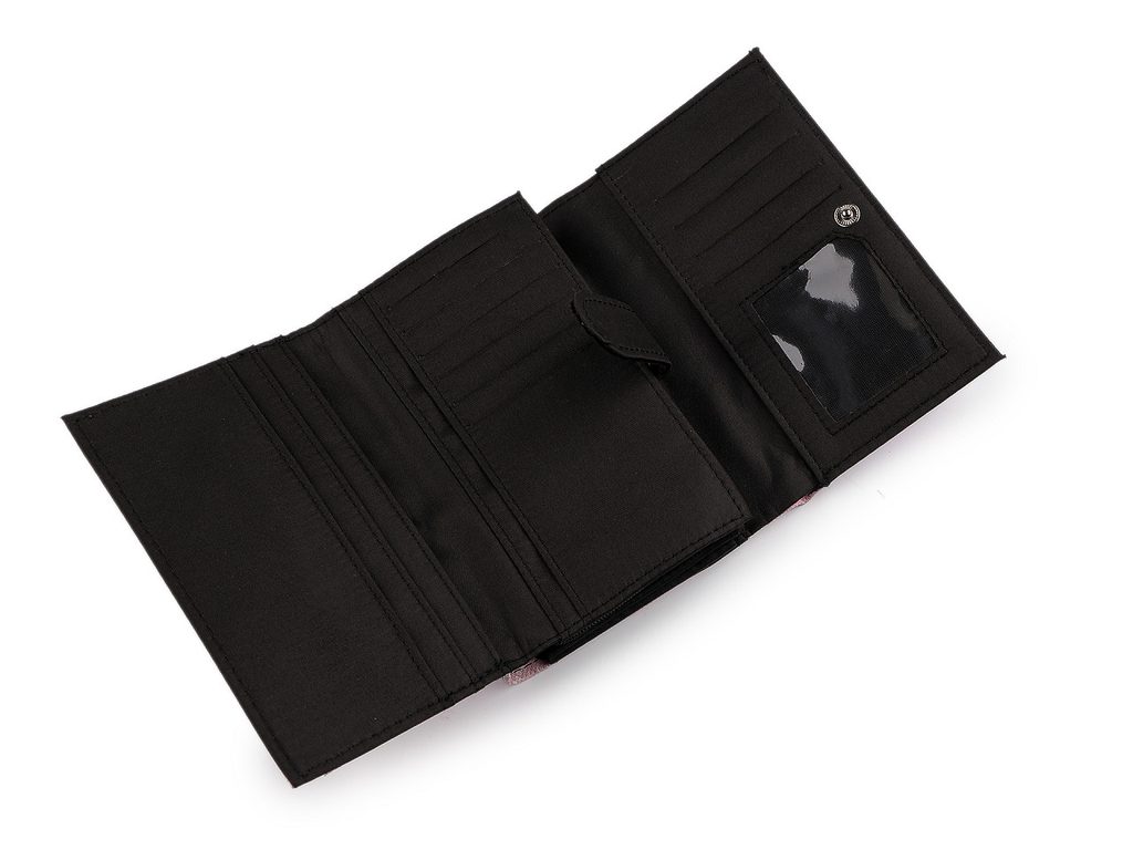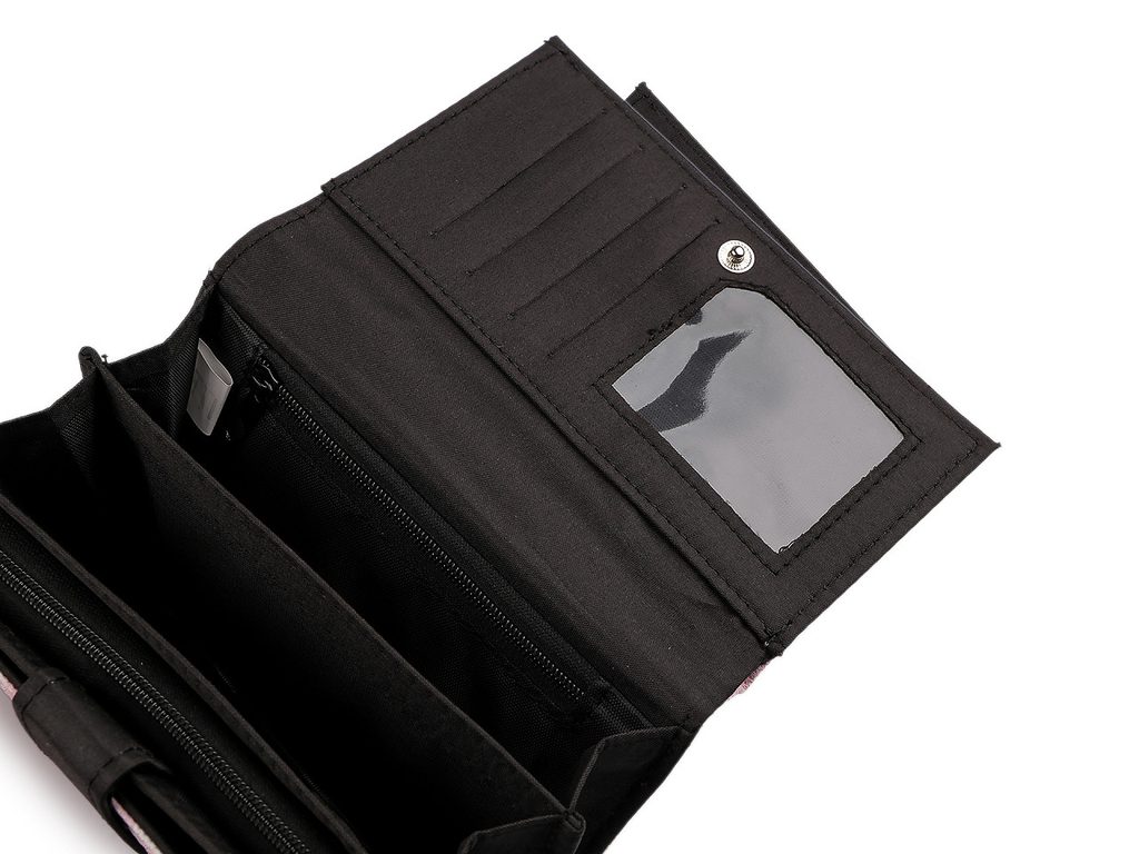 Zavírá se na klopu a patent. Uvnitř jsou 2 oddělené prostory. Po pravé straně jsou 4 přihrádky na karty, z toho je 1 průhledná. Pod nimi je 1 velká plochá kapsa. Uprostřed peněženky se nachází 2 kapsy na bankovky, v jedné je malá kapsička na zip. Vlevo je mincovník, který se zapíná na zip. Peněženka ukrývá ještě druhý oddíl, který se objeví po odepnutí zápinky na levé straně. Zde se nachází 6 přihrádek na kreditní karty a 5 plochých kapes.
