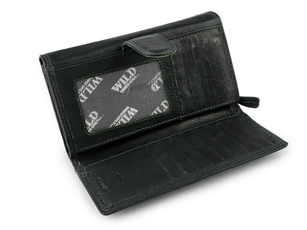 Peněženka má přední stranu na klopu na 2 patenty. Po otevření se objeví 7 přihrádek na kreditní karty, 1 je průhledná. Uprostřed peněženky jsou 2 dlouhé přihrádky a velký rozkládací mincovník rozdělený separací na 2 kapsy, který se uzavírá na zip. Na zadní straně se peněženka uzavírá zápinkou s patentem. Po otevření se spousta přihrádek na kreditní karty, 1 je průhledná a 2 dlouhé ploché kapsy.