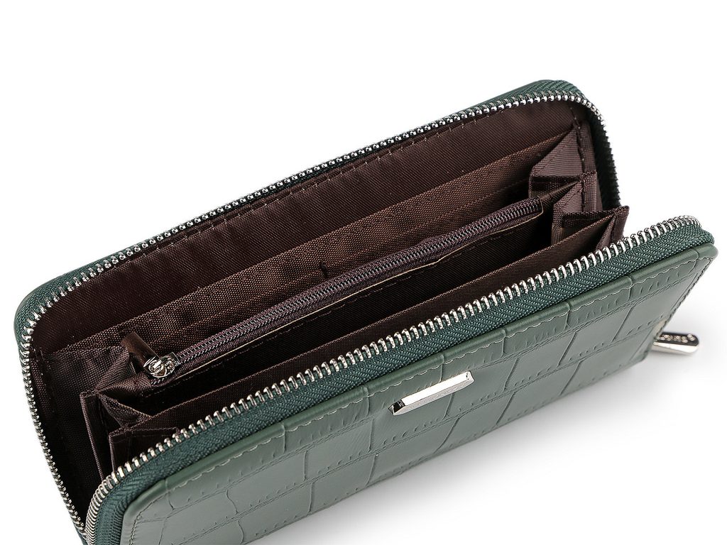 Zapíná se na zip. Uvnitř se nachází tři přihrádky na bankovky a jedna kapsa s otvíráním na zip, sloužící k uschování mincí. Na vnitřních stranách peněženky pak najdete přihrádky k uložení karet či dokladů.