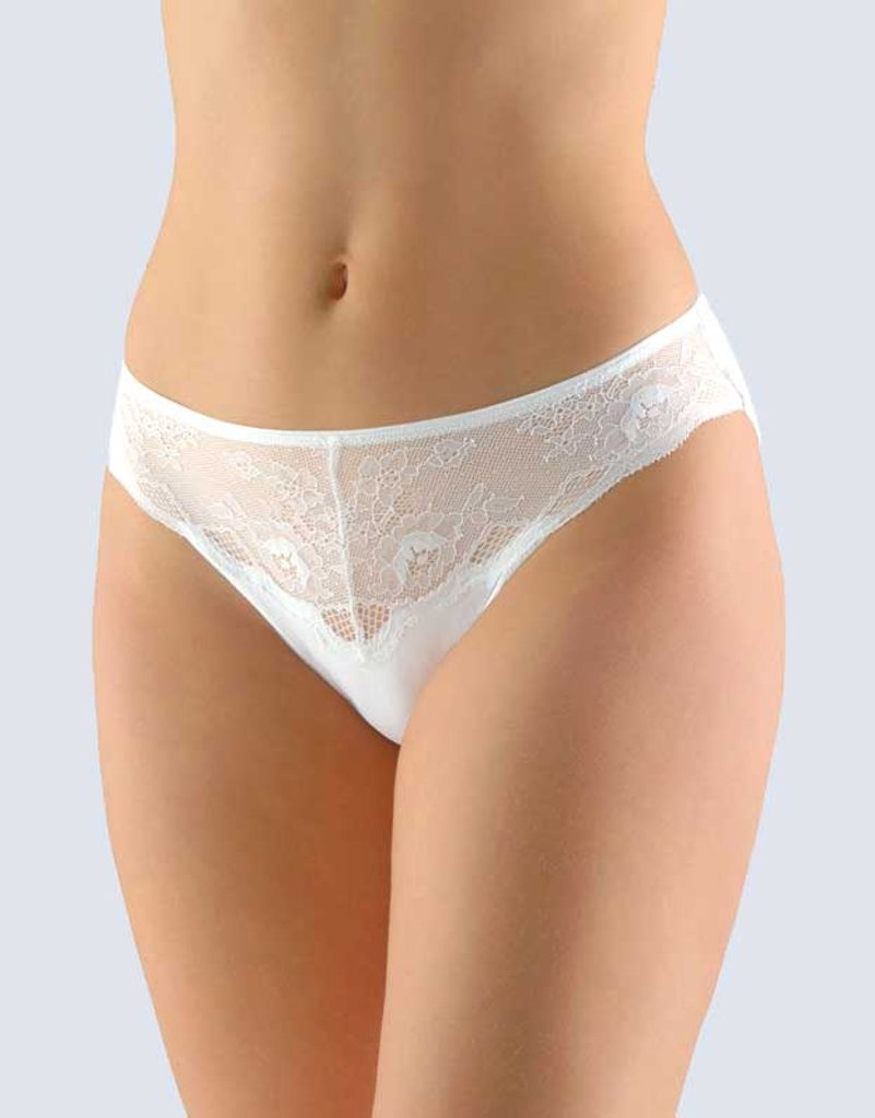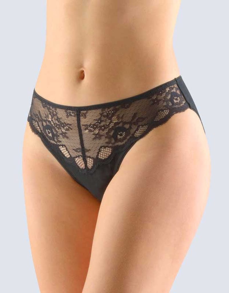 Dámské kalhotky se zvýšenou linií pasu jsou ozdobené dvěmi krajkovými průhledy v přední části. Vnitřní část rozkroku kalhotek je podšita bavlněnou látkou.