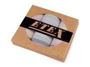Kapesníky jsou zabalené v dárkové krabičce přírodního vzhledu s kulatým průhledem.