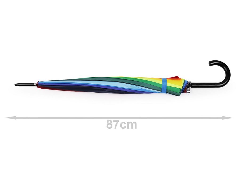 Duhový vystřelovací deštník vás spolehlivě ochrání před nepřízní počasí. Skládá se z 16 výsečí, díky kterým se deštník řadí mezi špičkové kousky. Konstrukce je vyrobena z pružných lamel zajišťujících vysokou pevnost a stabilitu. Deštník má klasickou tyč zakončenou pevnou rukojetí.