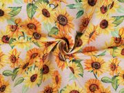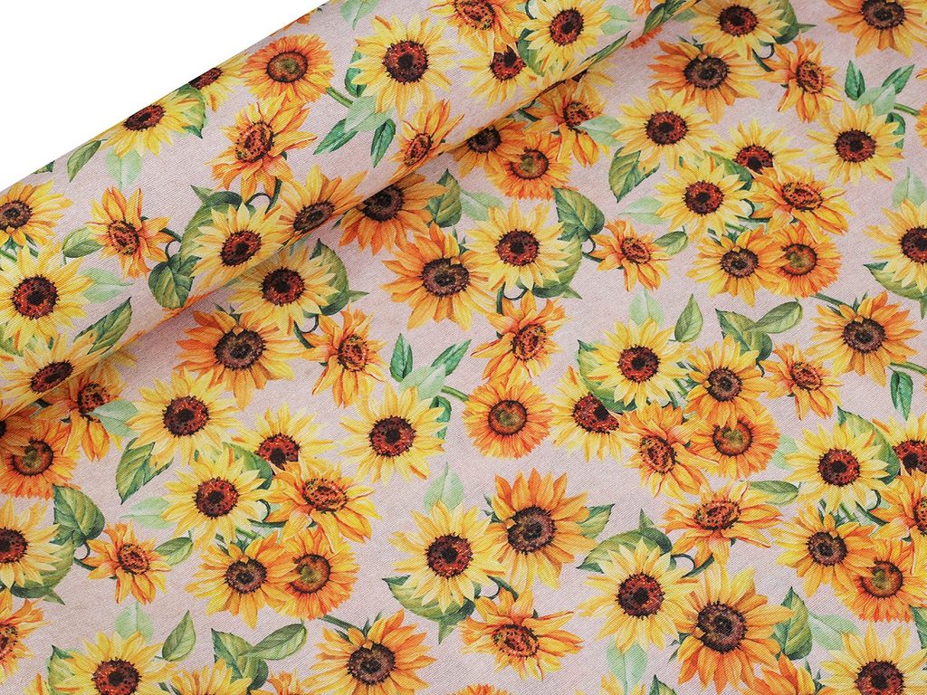 Pevnou dekorační látku se slunečnicemi využijete na šití ubrusů, prostírání, povlaků na polštáře, podsedáků a dalších bytových dekorací. Můžete z ní ušít i tašky.