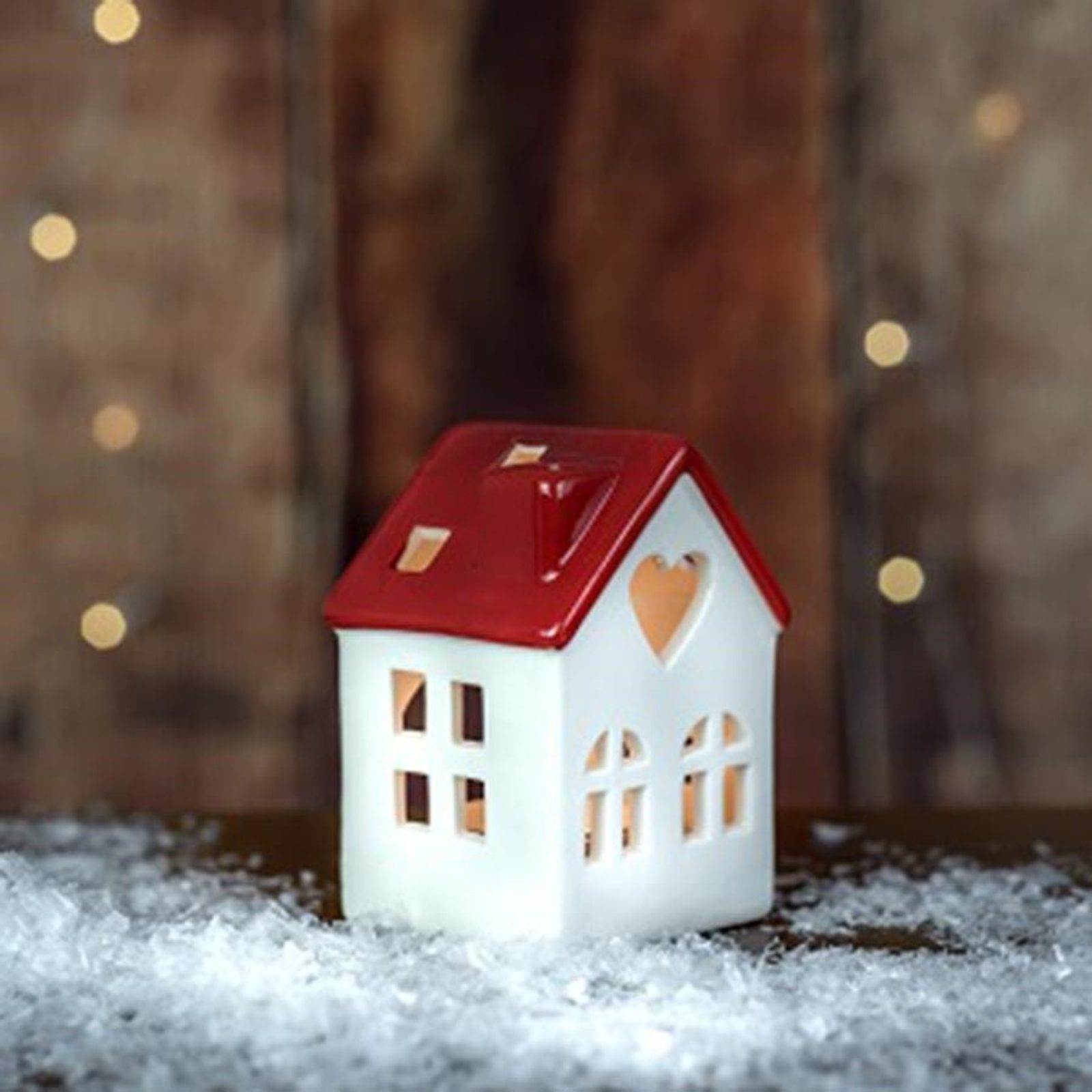 Dekorační domeček na svíčku. Rozměry : 9,5 x 6,5 cm, výška 13,3 cm. Barva : kombinace bílá s červenou. Materiál : keramika.