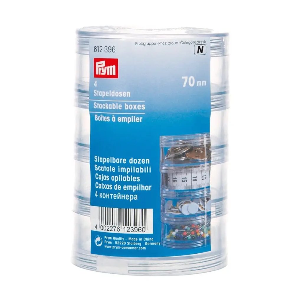 Plastové stohovatelné dózy na drobné předměty. Sada obsahuje 4 do sebe zašroubované dózy a jedno víčko na horní dóze.