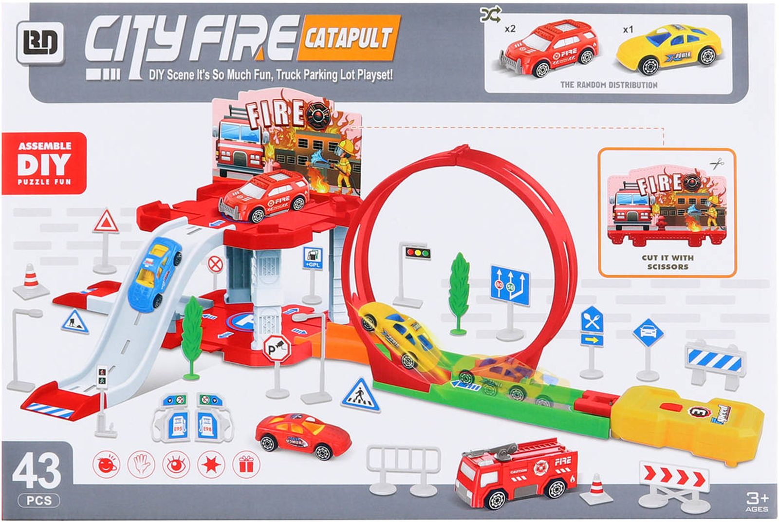 Dráha hasičská stanice s katapultem set se 3 autíčky a dopravním značením