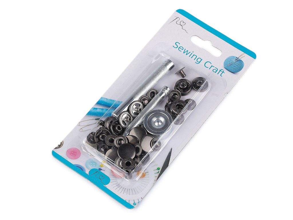 Knoflík stiskací Ø15 mm na středně silné látky, s ručním kovovým aplikátorem