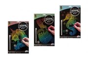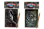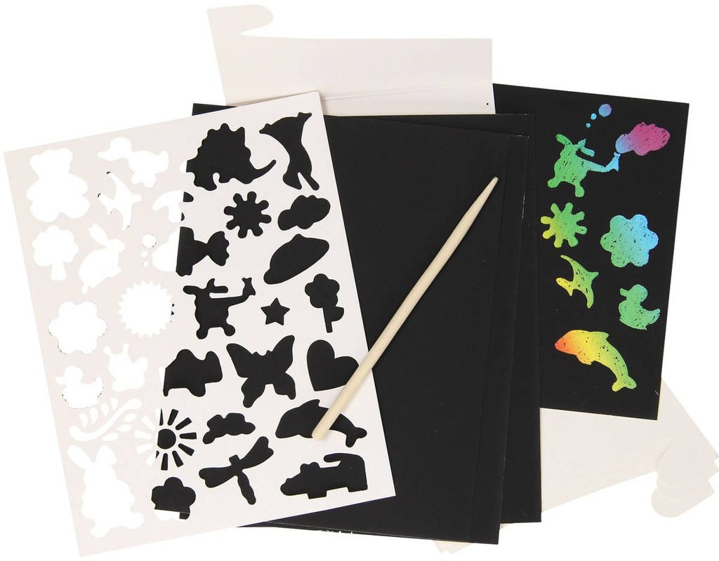 Zábava s barevným koncem! Škrabací obrázky probouzí kreativitu a nadšení a nejen malé výtvarníky zaměstnají na dlouhé hodiny. Papír potažený černou vrstvou překrývá podklad s duhovým efektem. Přiloženým škrabacím perem vyškrábejte linky předtištěného obrázku. Fantazii se meze nekladou, proto je možné vyškrábat i černá místa bez potisku a dodat obrázku osobitý rámeček.