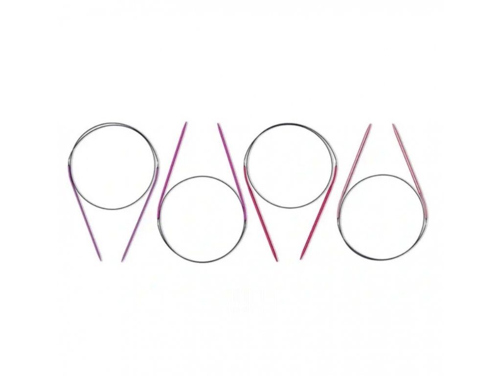 Pletací jehlice jsou spojené plastovým lankem, tento typ se využívá na pletení dokola bez švů, ideální na pletení ze středně silných přízí.