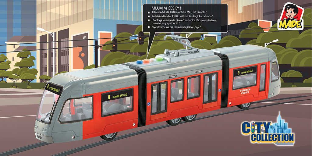 Tramvaj MHD česká na setrvačník hlásí stanice na baterie Světlo Zvuk CZ