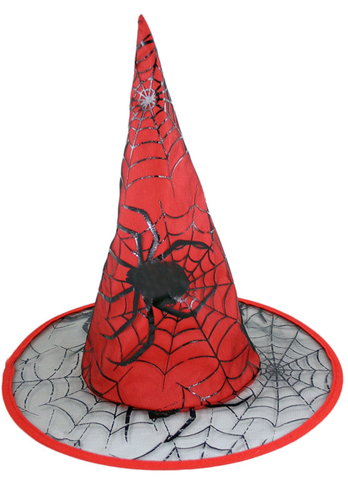 Kouzelný klobouk červené barvy zdoben černými magickými pavučinami a síťkou je určen pro dospělé. Výška klobouku činí 37 cm.