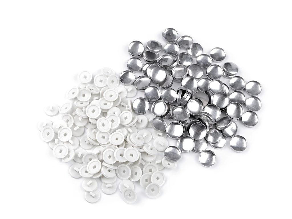 Knoflík využijete na potahování. K potažení můžete zvolit různé materiály. Vrchní část knoflíku je hliníková a spodní je plastová.