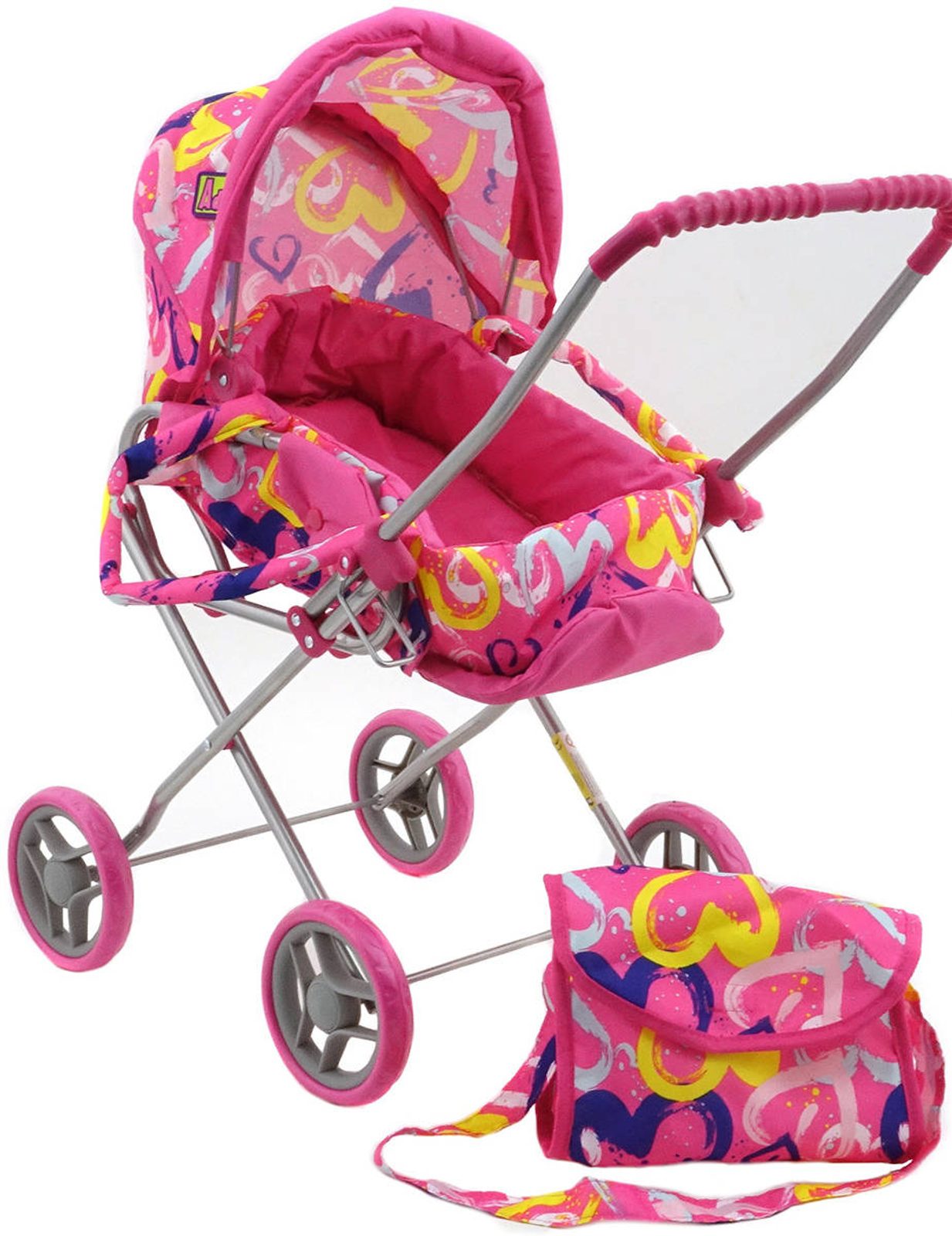 Kočárek pro panenku 3v1 hluboký růžový (taška, srdíčka)