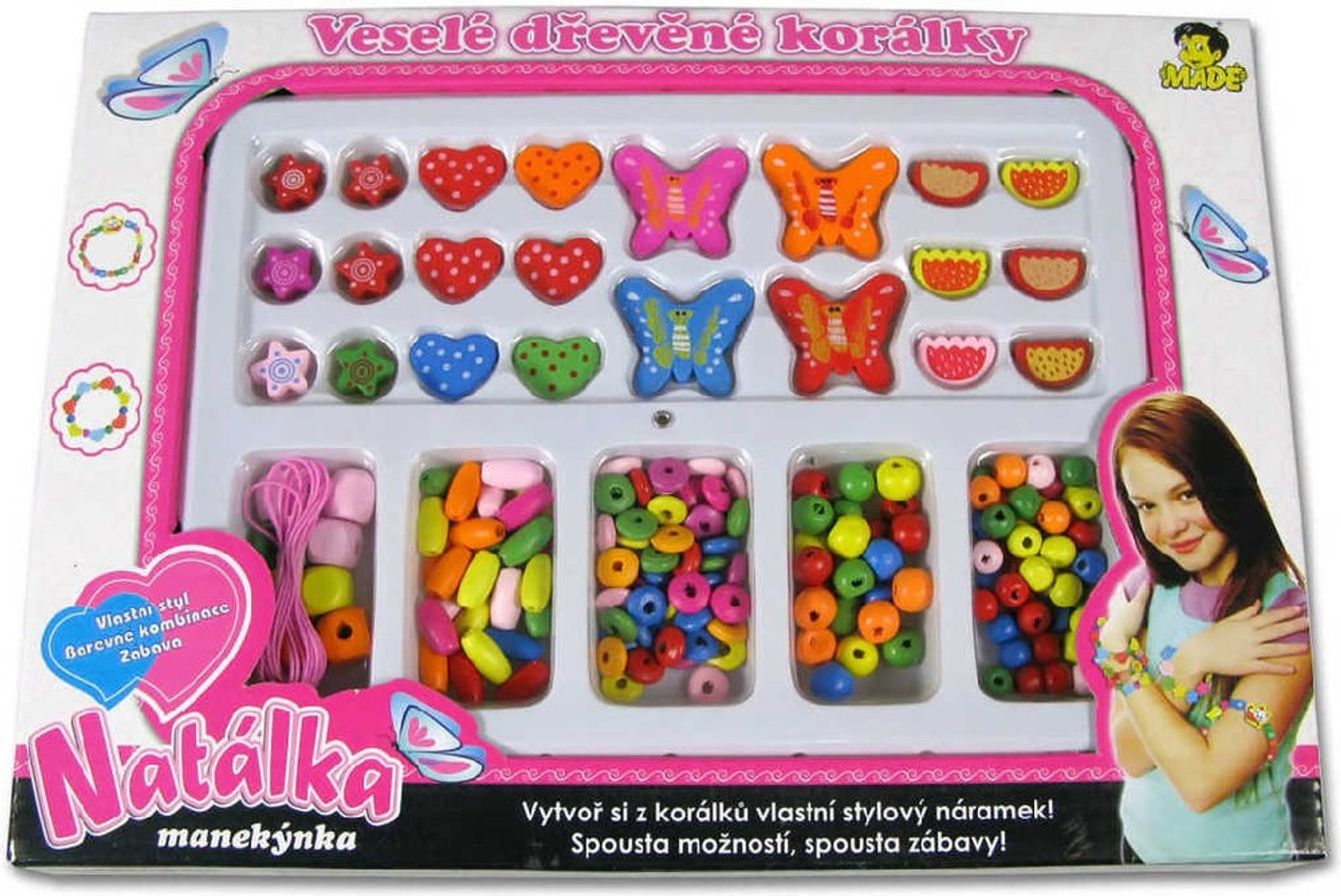 WOODY DŘEVO Srdíčko set navlékací korálky s provázky rámeček na foto 2v1
