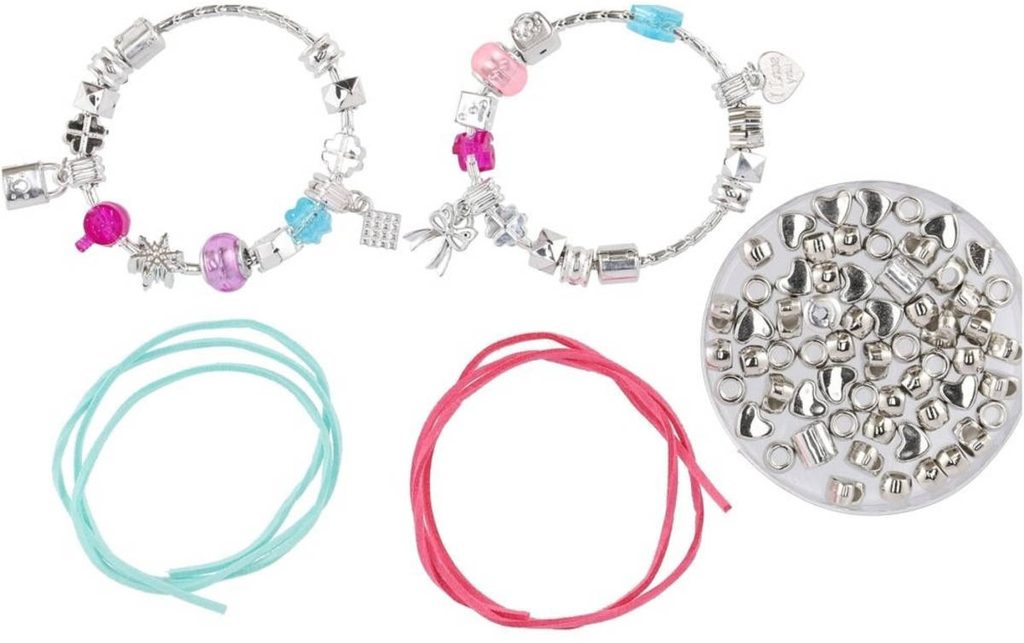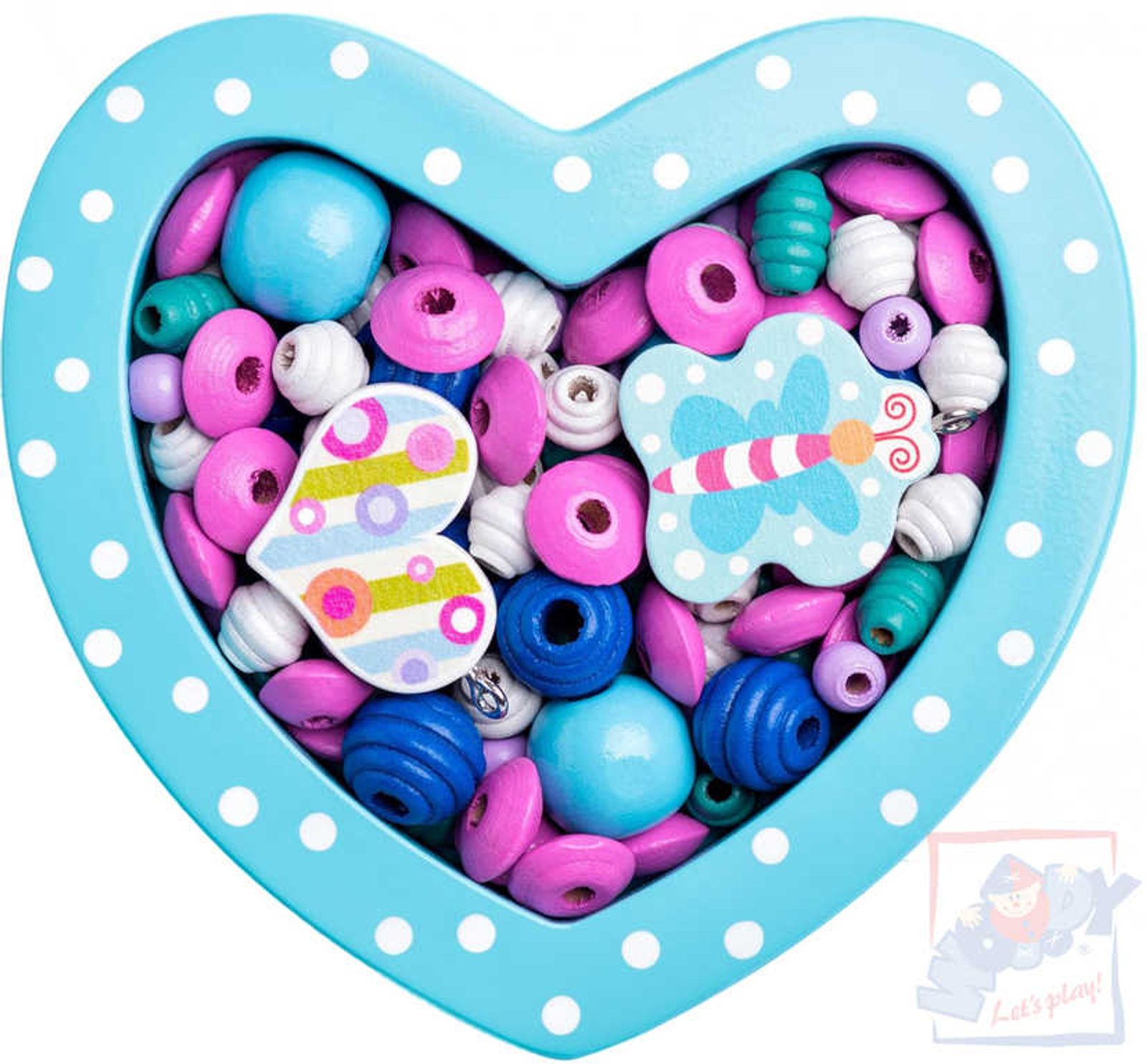 Toto srdíčko obsahuje velké množství klasických i soustružených korálků a přívěsků různých tvarů a velikostí a také tenké tkanice s koncovkou k provlékání, v převážně modrých a růžových odstínech. Kreativní sada pro všechny šikovné holčičky a parádnice, které by si rády vyrobily vlastní originální náramek či jinou ozdobu.