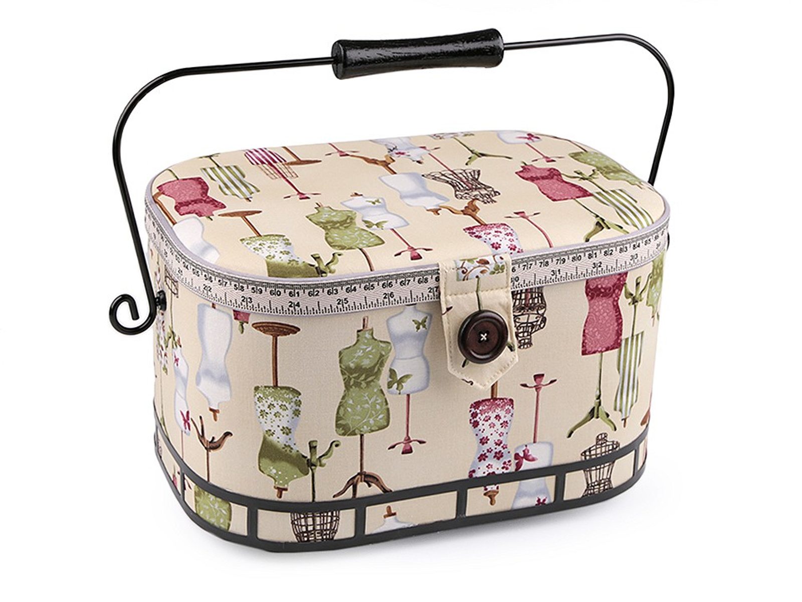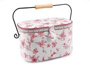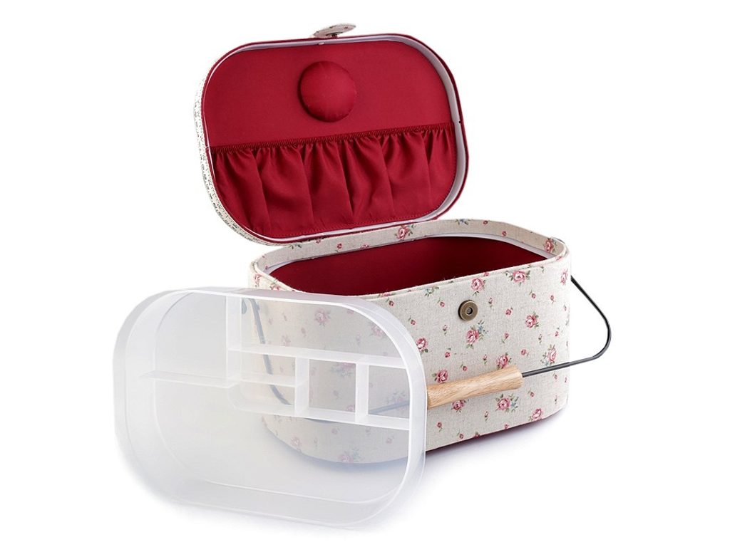 Do čalouněného košíku s potiskem růžiček se vám vejde plno šicích potřeb. Uvnitř se nachází praktické odnímatelné patro z průhledného plastu, které má 1 velkou a 6 malých přihrádek. Ve víku jsou 2 textilní kapsy a kulatý jehelníček. Košík se zapíná na magnetický patent, má kovové madlo s dřevěnou rukojetí na pohodlné přenášení. Dole jsou 4 nožičky ve tvaru kuliček.