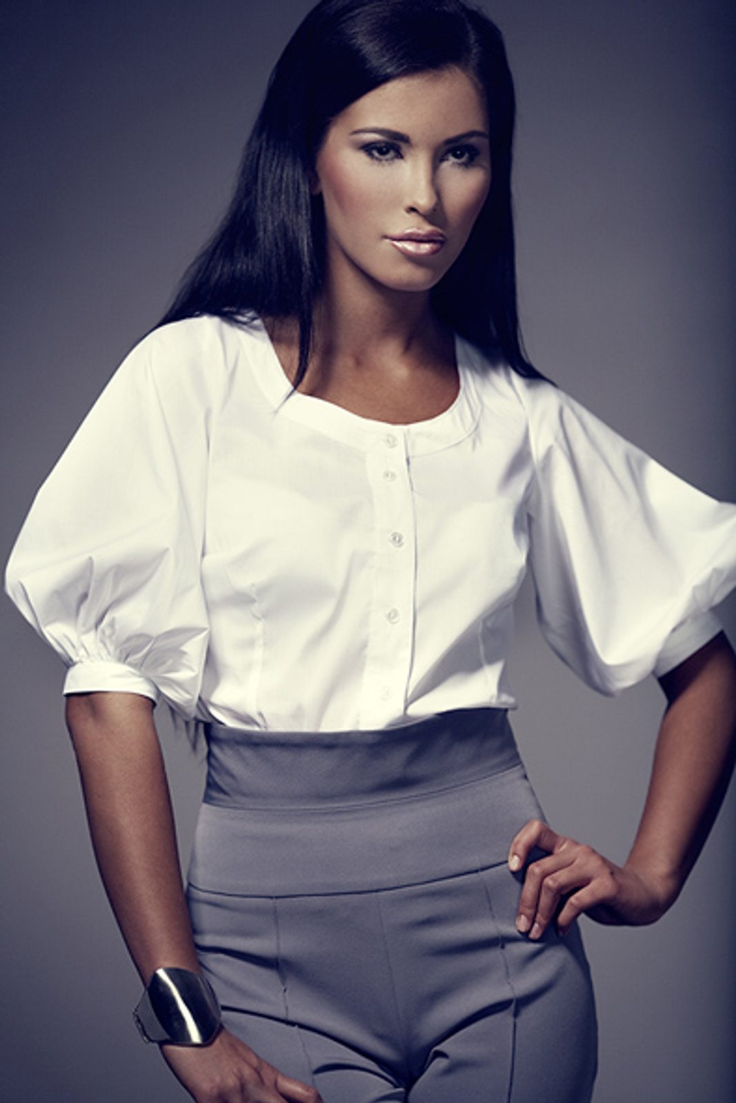 Dámská elegantní košile Figl s 3/4 rukávy, které mají balonový střih. Košile se zapíná pomocí knoflíčků. Košile je vyrobena z příjemného materiálu s bavlnou. Košile je ideální pro všechny ženy, které mají rády eleganci a vkus.