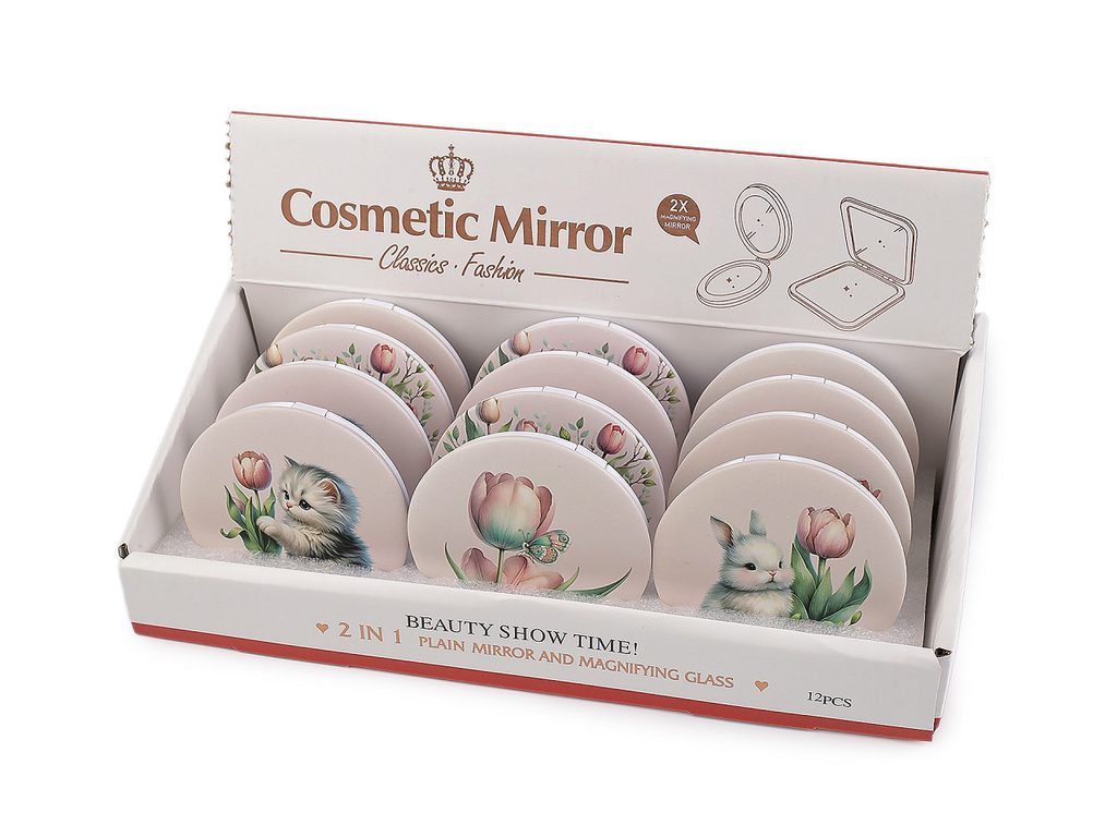 Kosmetické zrcátko s potiskem zvířátka je ideálním společníkem pro každodenní použití. Je ploché, plastové a lehké, snadno se vejde do každé kabelky či kosmetické taštičky. Jeho design s roztomilými zvířátky a květinovým motivem dodává produktu jemný a hravý vzhled, který potěší nejen děti, ale i dospělé, je skvělým pomocníkem pro opravu make-upu během dne. Uvnitř jsou 2 zrcátka.