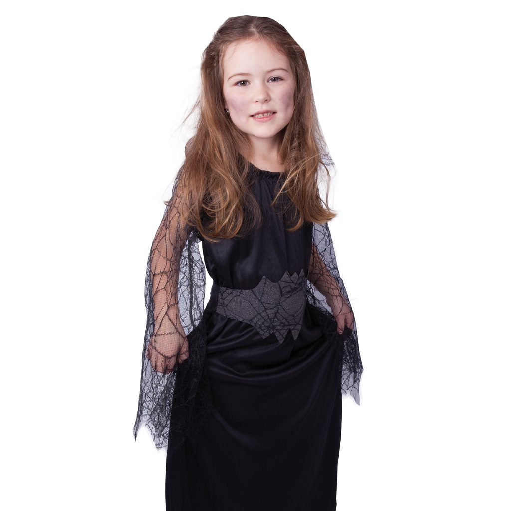Kostým pro malé čarodějnice! Kostým černé barvy ve velikosti M je určen pro holčičky ve věkovém rozmezí 6-8 let (116-128 cm). Šaty jsou dekorovány průhlednými rukávy s motivem pavučin. S tímto úchvatným kostýmem budeš vypadat jako pravá čarodějka!