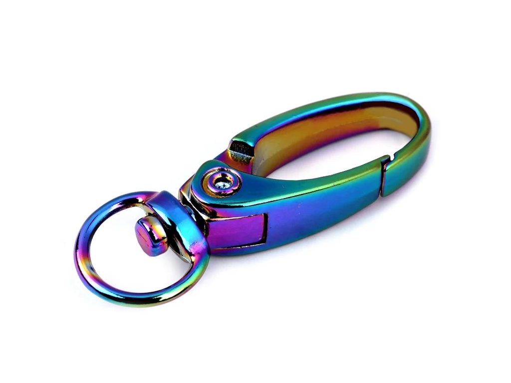 Kovová karabina má efektní holografický povrch, který hází zajímavé odstíny. Využijete ji na upevnění popruhů k taškám a kabelkám. Je otočná.