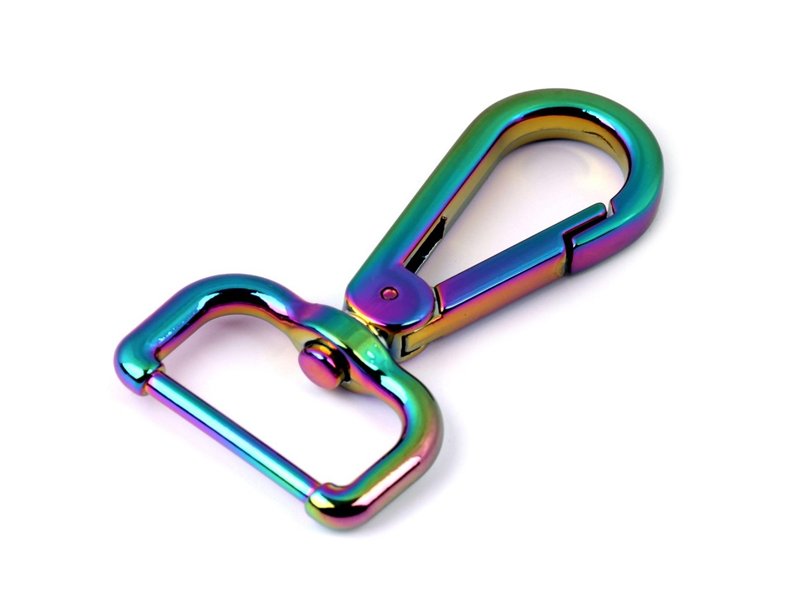 Kovová karabina upoutá pozornost svým holografickým povrchem, který hází zajímavé odstíny. Využijete ji na upevnění popruhů k taškám a kabelkám. Je otočná.