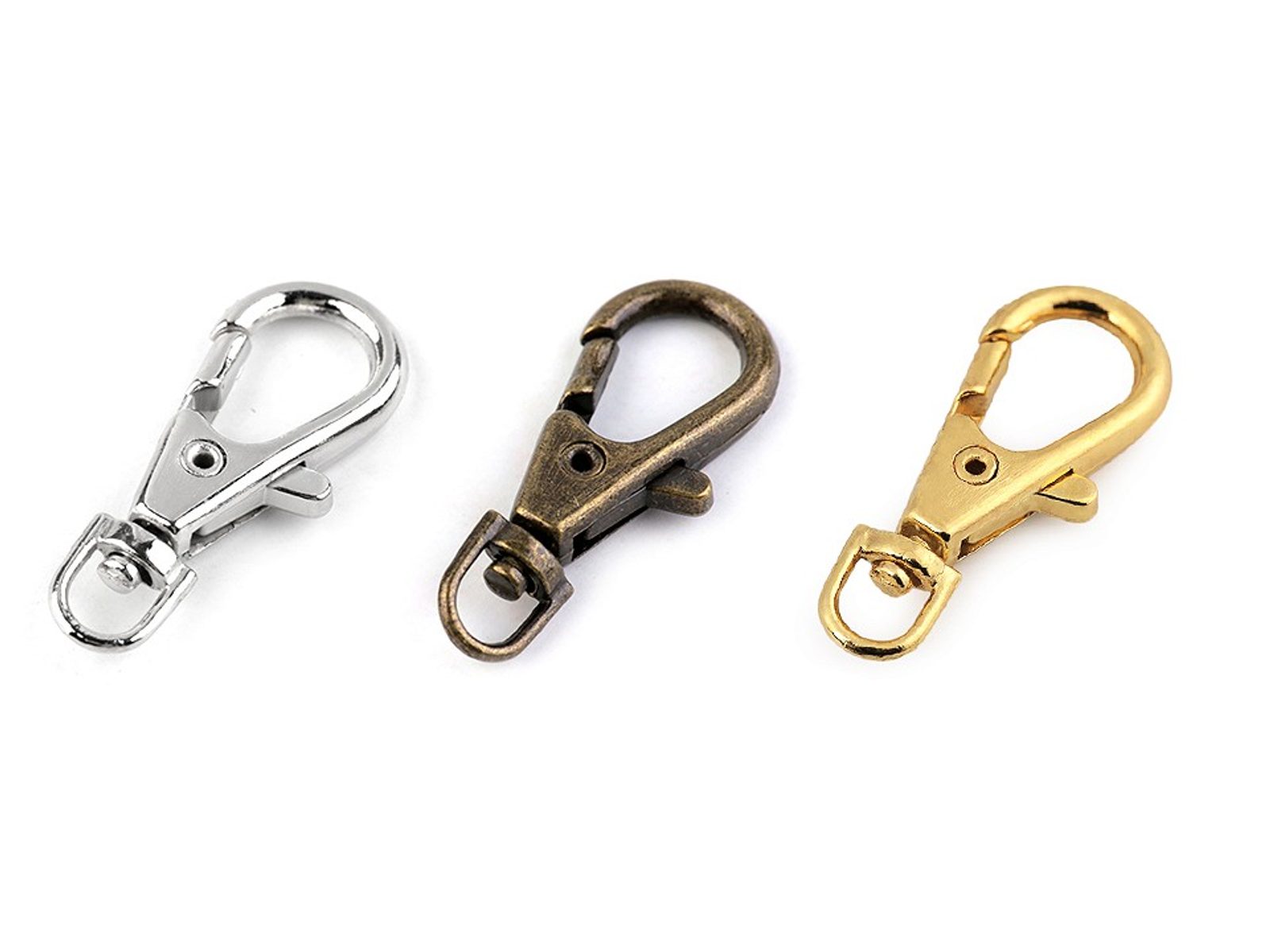 Kovová karabinka je připevněná na otočném obrtlíku. Je vhodná k výrobě klíčenek, případně k upevnění řetízků na menší kabelky nebo psaníčka. Využijete ji také k výrobě vodítek pro menší domácí mazlíčky.