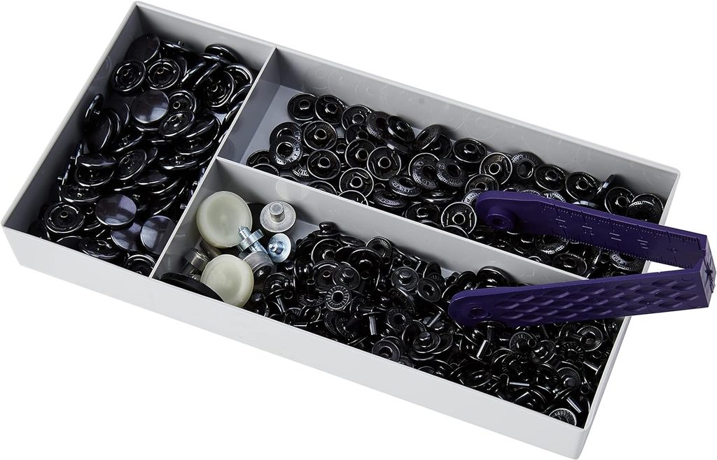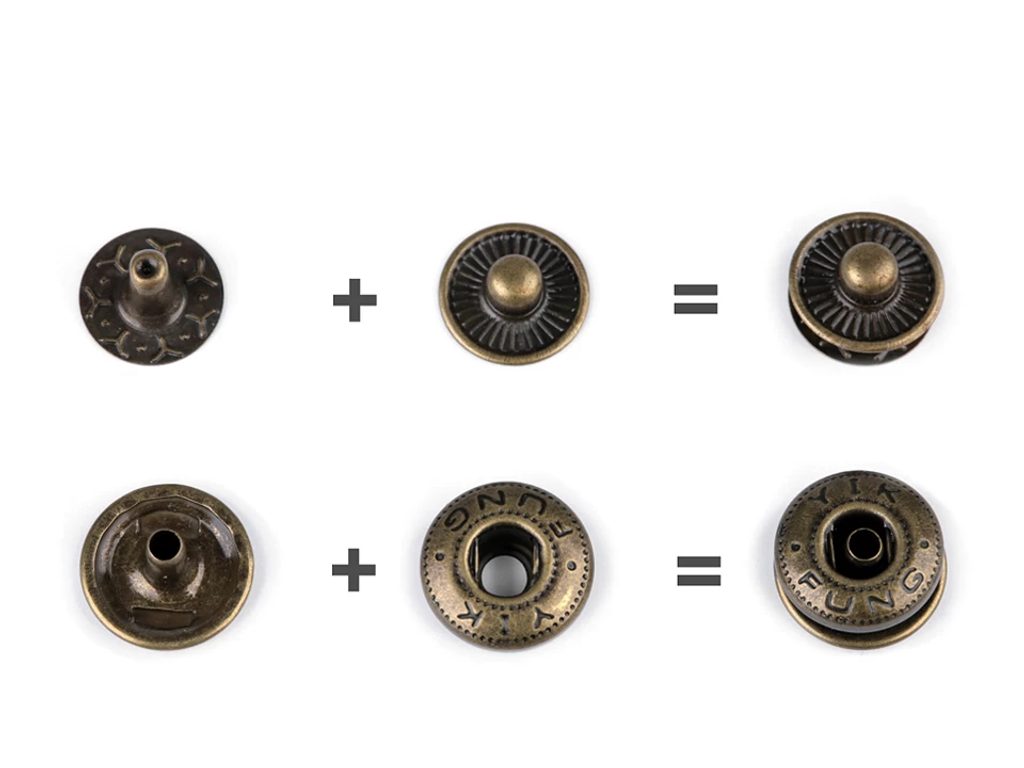 Tato sada obsahuje 50 kovových druků o průměru 12 mm. Druky jsou složené ze 4 dílů (matice + korunka + podložka + trn), které se spojují pomocí nýtování lisem nebo pístonem. Používají se zejména pro středně silné materiály (např. látky, koženku, plátno) a dodávají oděvům, doplňkům nebo galanterii elegantní kovový detail.