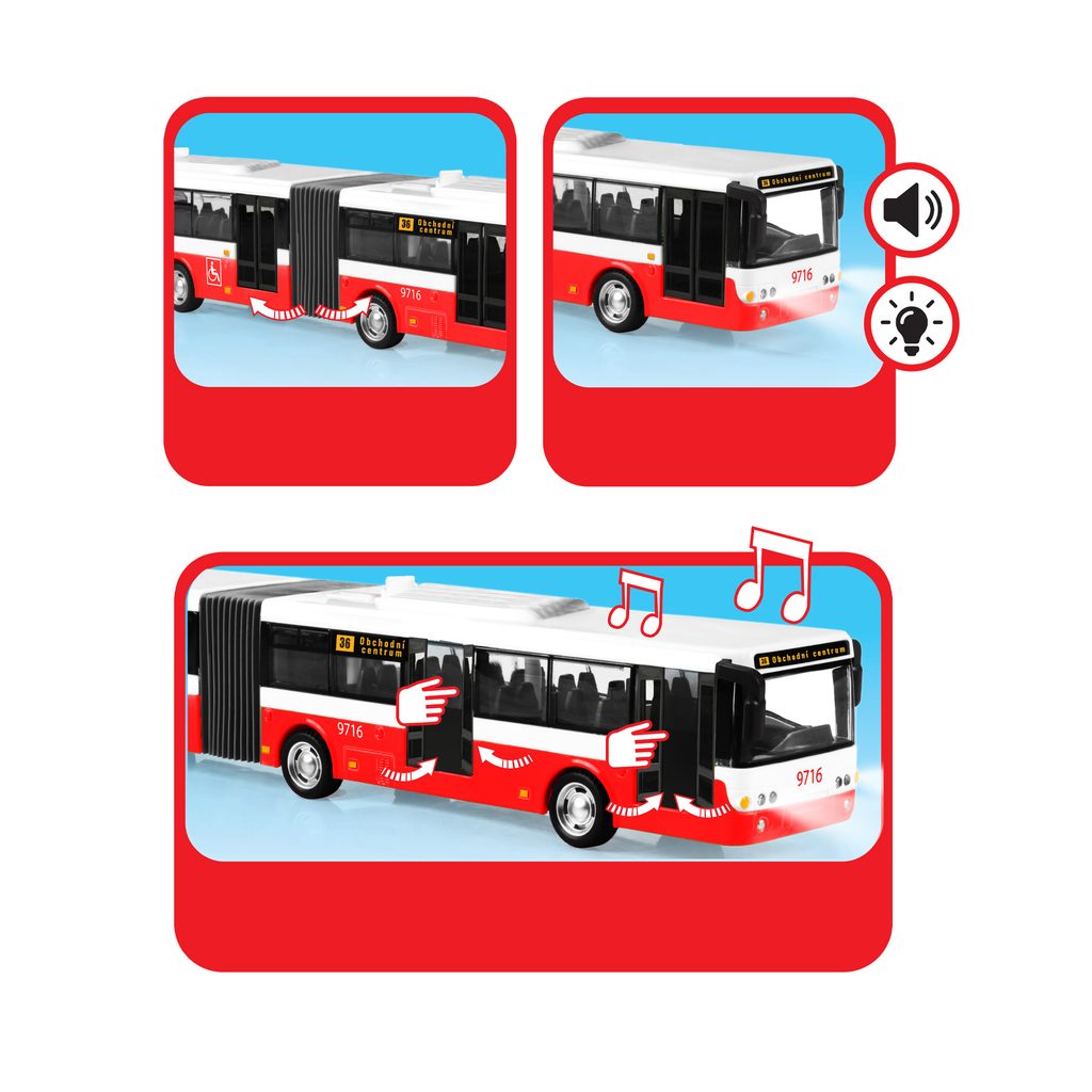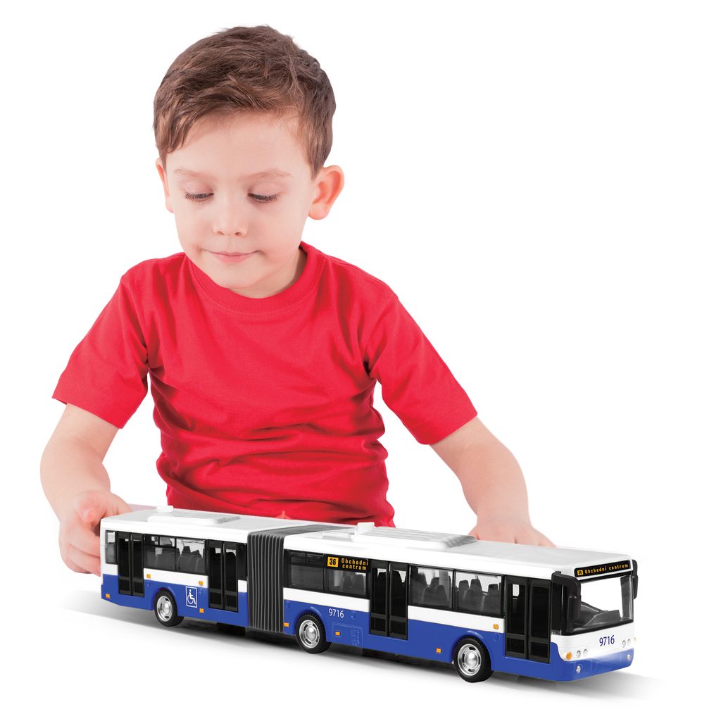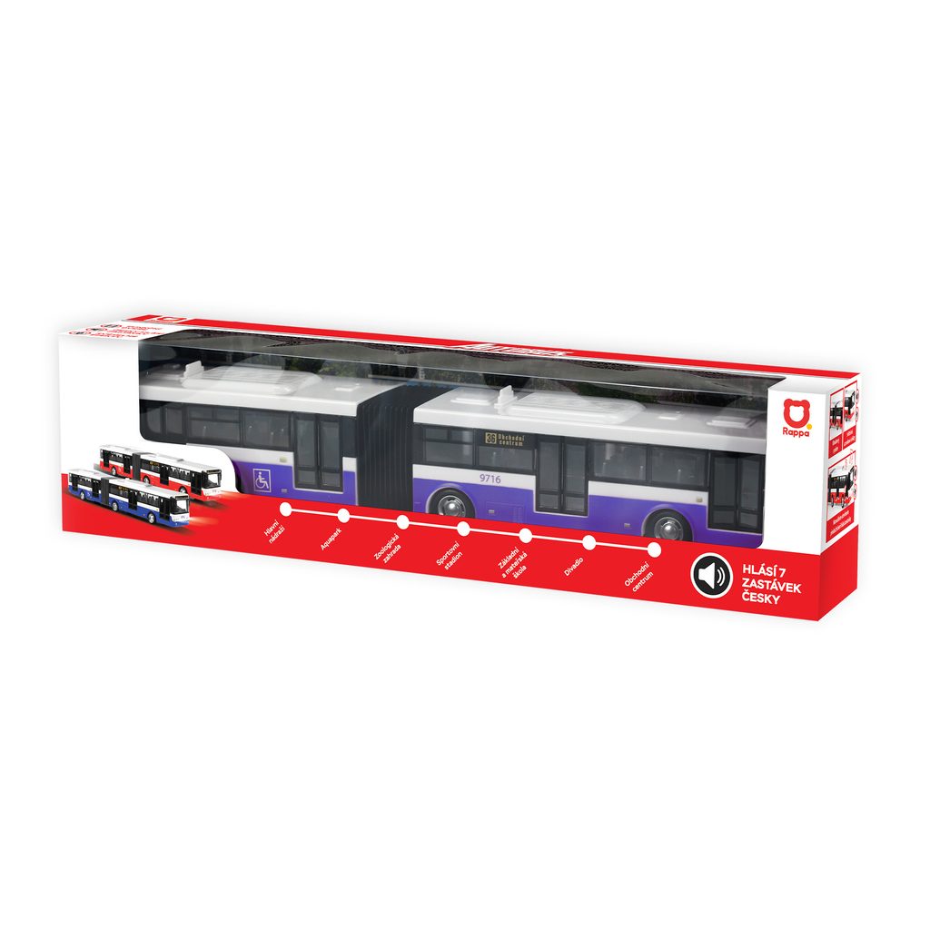 Kloubový autobus který hlásí zastávky česky 36 cm modrý