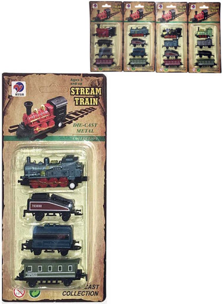 Vlak kovový mini historický set mašinka + 3 vagónky zpětný nátah 4 druhy na kartě