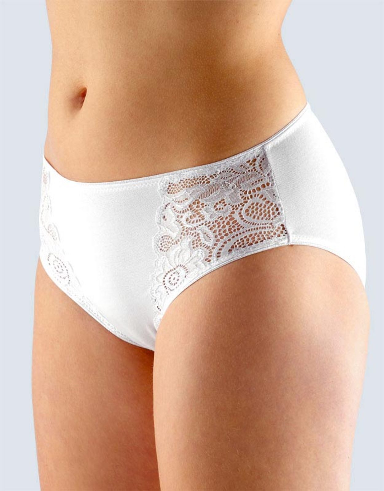 kalhotky klasické, širší bok, šité, s krajkou, jednobarevné značky GINA, kód 10115. Složení: 47,5% Bavlna 47,5% Modal 5% Elastan. Kolekce: Delicate