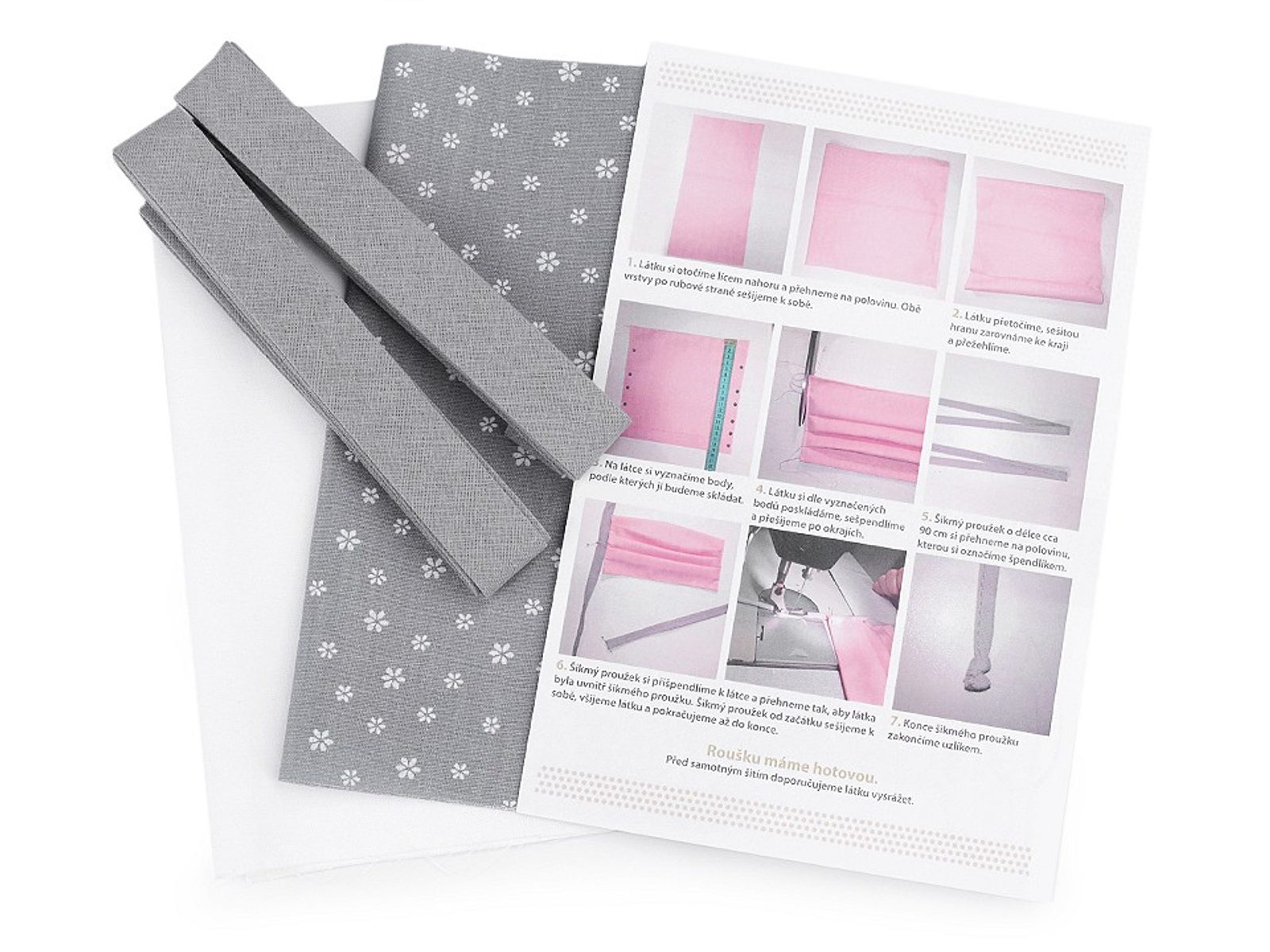 V sadě najdete 2 ks bavlněné látky o rozměrech cca 20 x 40 cm, 4 ks šikmých proužků o šíři 20 mm a délce 100 cm a obrázkový návod, jak si roušku ušít.
