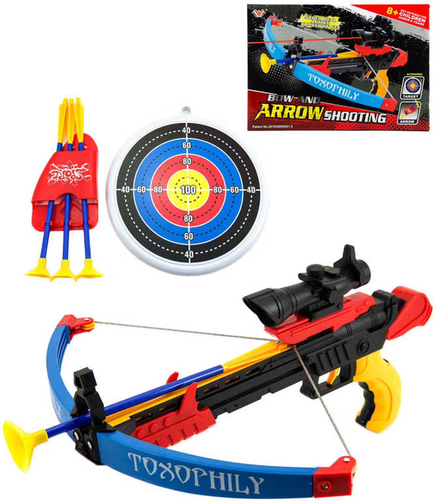 Kuše dětská plastová set se 3 šípy s přísavkou a terčem v krabici