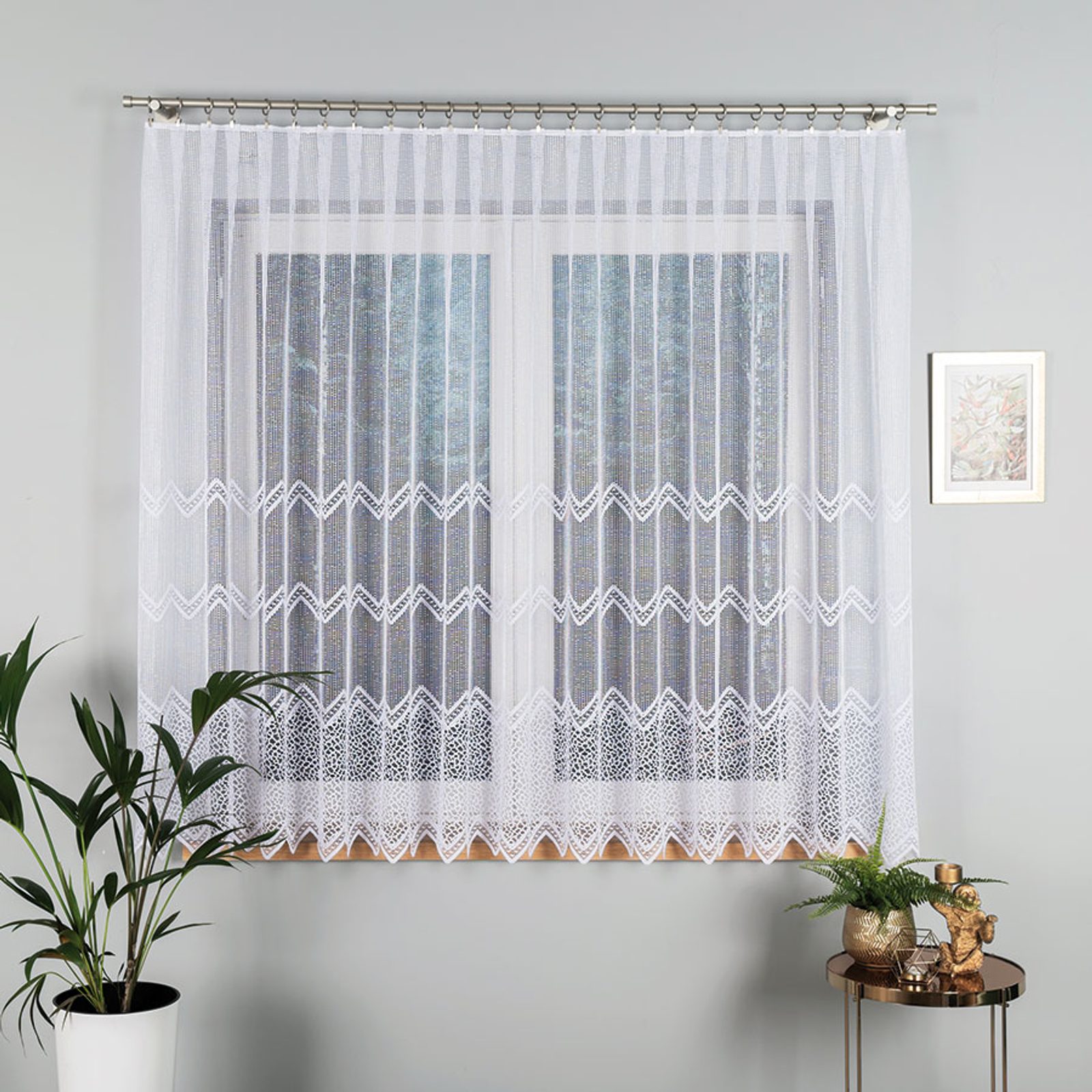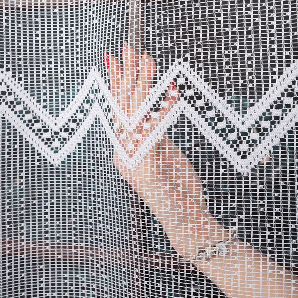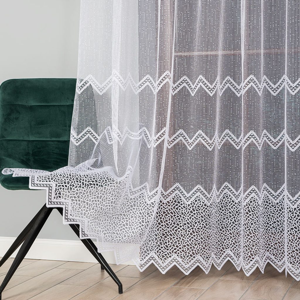 Hrubší záclona s geometrickým vzorem, který vypadá na okně velice zajímavě.