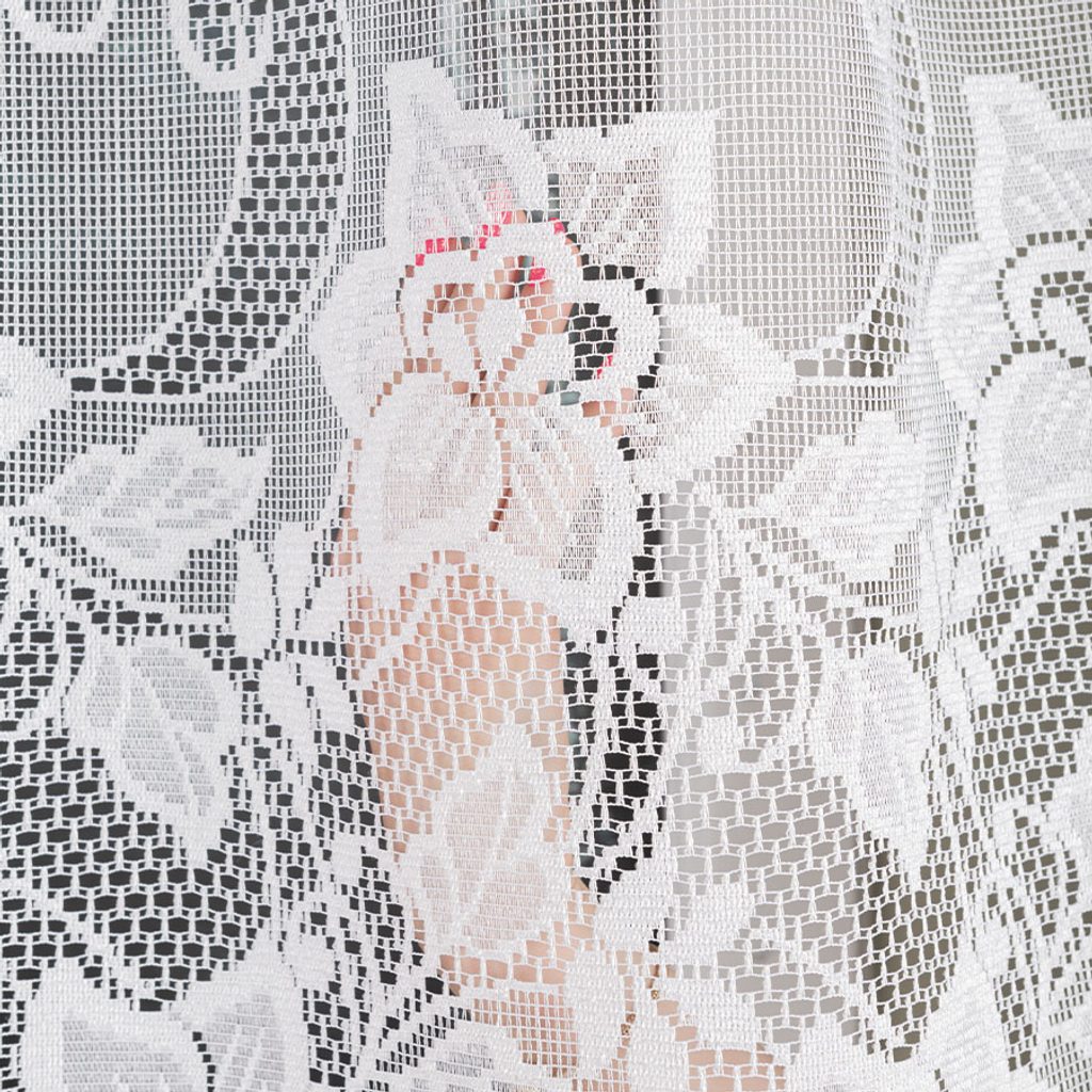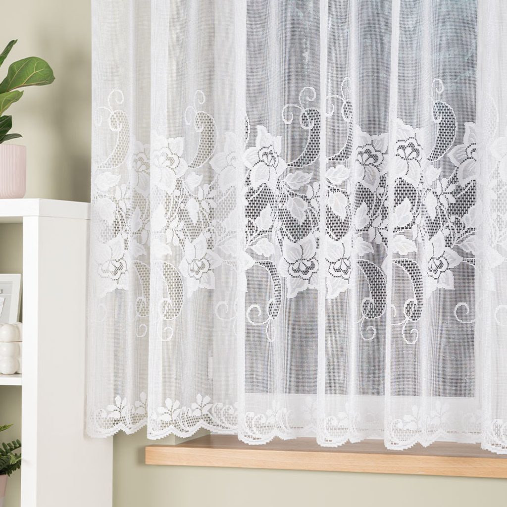 Kusová žakárová záclona s floristickým vzorem. Záclona má výrazný floristický vzor v prostřední části, podklad záclony i vzor má větší očka. Záclona se hodí do kuchyní, obývacích pokojů či ložnic.