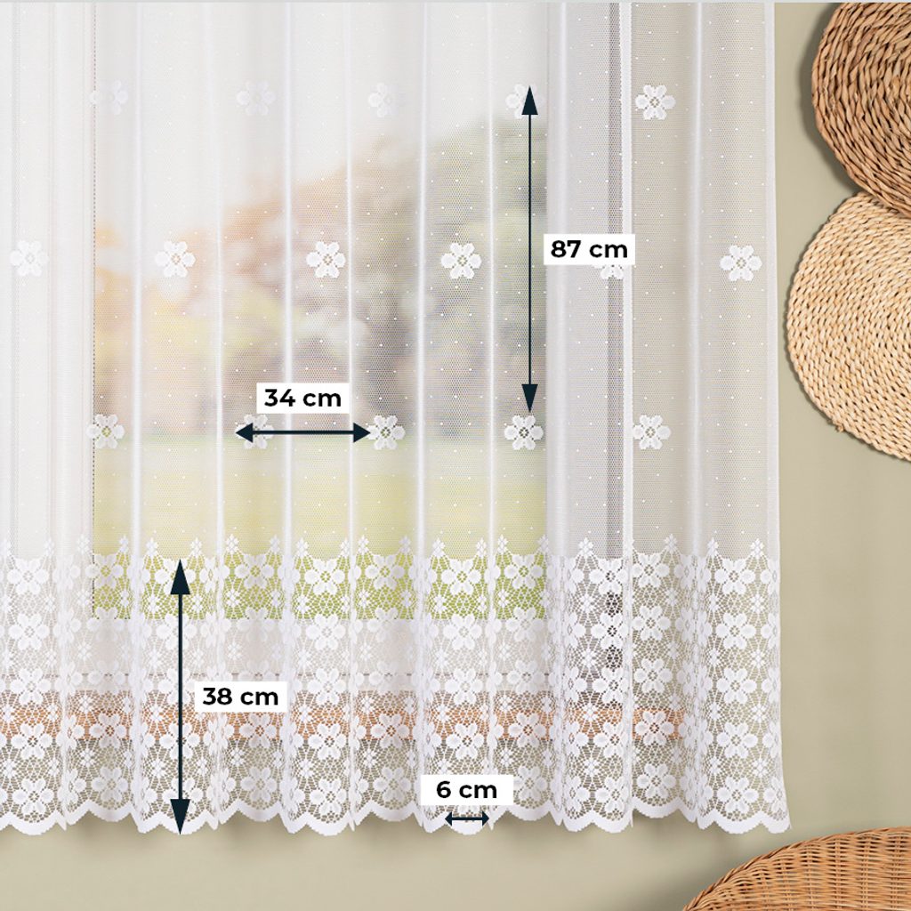 Květinková záclona, která vypadá na okně velice zajímavě, a to díky své bohaté spodní borduře. Záclona je zakončena bordurou ozdobných vlnek, které jí dodají efektivní vzhled. Kusová záclona je opatřena řasící stuhou F1 s pravidelnými sklady 1:2.