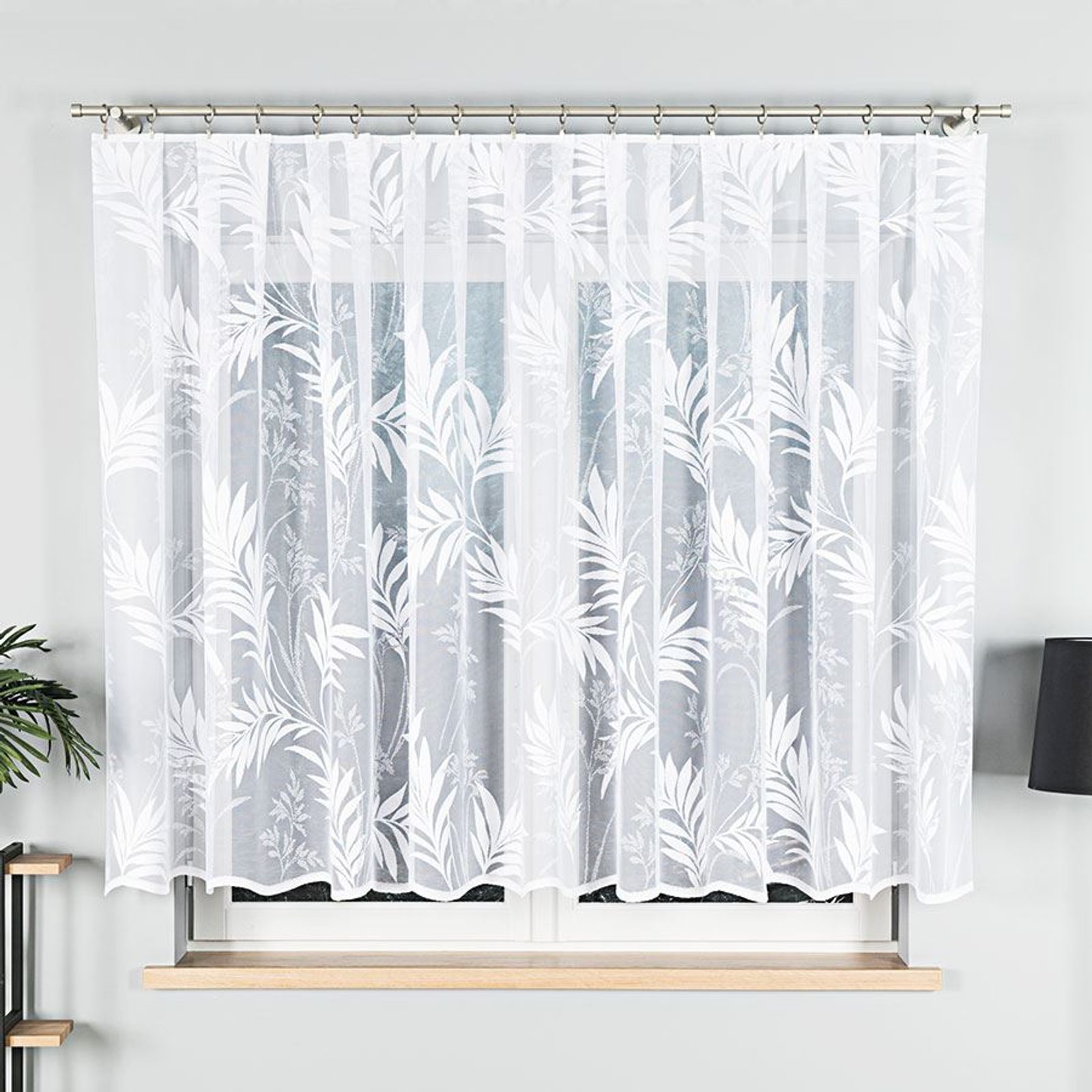 Kusová žakárová záclona s celoplošným floristickým vzorem. Záclona má vzor palmových listů po celé ploše. Záclona se hodí do kuchyní, obývacích pokojů či ložnic. Kusová záclona je opatřena řasící stuhou F1 s pravidelnými sklady 1:2.