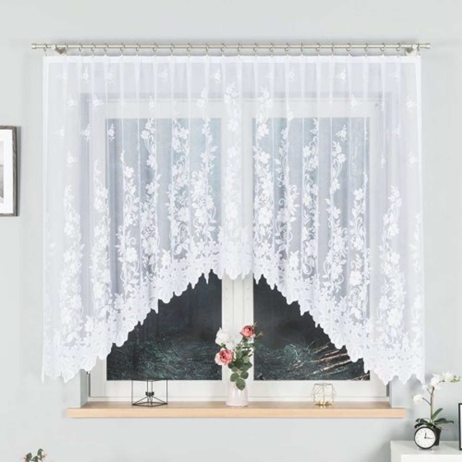 Žakárová záclona tkaná do oblouku s floristickým vzorem. Záclona Ludvika vypadá na okně velice elegantně. Obloukové záclony jsou velice oblíbené, jelikož nechají vyniknout parapet, který můžete využít na dekorace nebo květiny. Záclona se hodí především do kuchyní.
