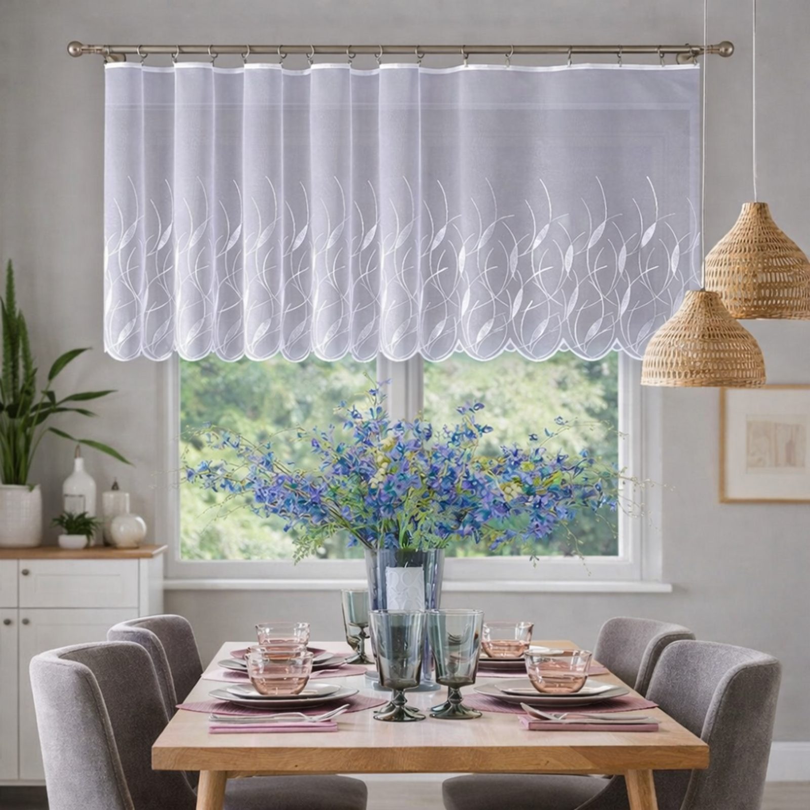 Hotová, jemná bílá žakárová záclona s abstraktním motivem, který ve spodní části vytváří působivou a elegantní borduru. Díky decentnímu vzoru působí na okně velmi vkusně a lehce.