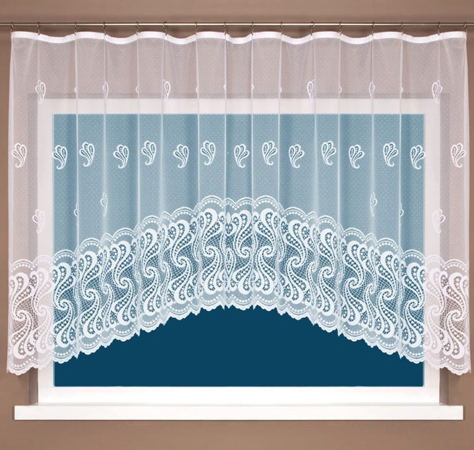 Kusová žakárová záclona v bílé barvě zakončena do oblouku. Záclona Zora má bohatý geometrický vzor s velice výrazným spodním okrajem. Obloukové záclony jsou velice oblíbené, jelikož nechají vyniknout parapet, který můžete využít na dekorace nebo květiny. Kusová záclona Zora je opatřena řasící stuhou F1 s pravidelnými sklady 1:2.