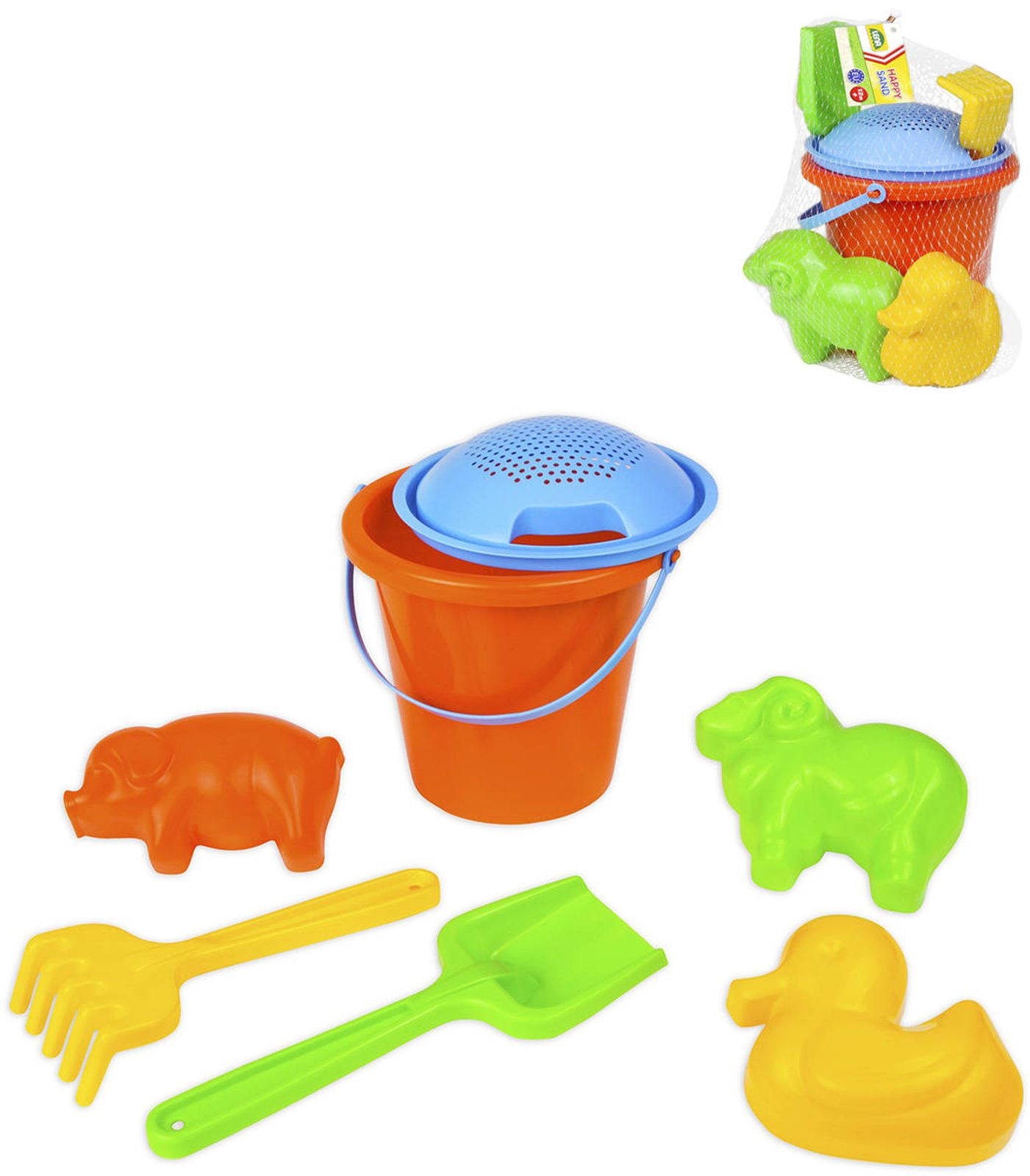 LENA Sada na písek kbelík s formičkami a nástroji se sítkem 7ks